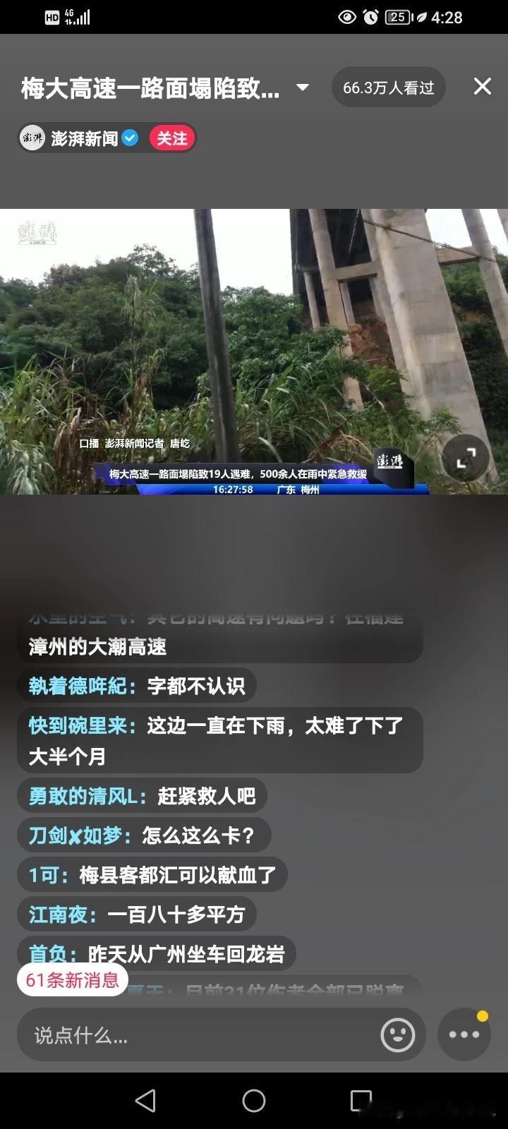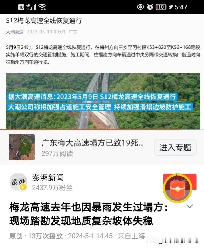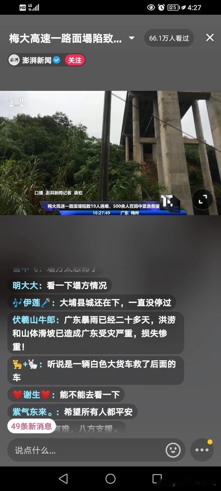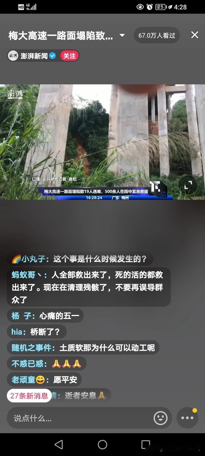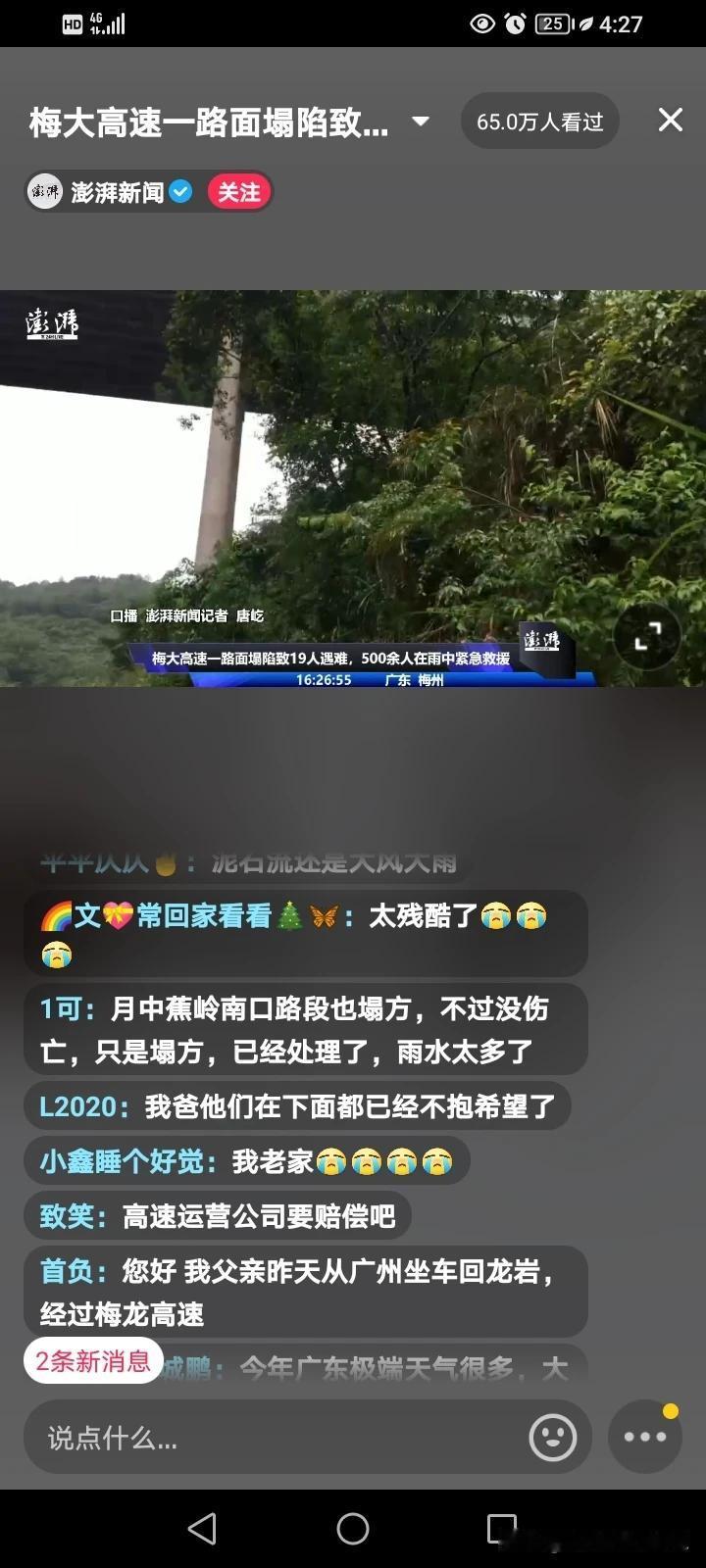 梅大高速最新情况,死了24个,伤了30个,不是18辆而是20辆,因为都被埋在下面了,我特意去看了一下现场直播,得到了很多消息:第一、塌方的地方长将近18米,塌方的面积将近185平,车辆滑落有7~8米深。 第二、出动了多个应急部门大概500人参与了现场救援,包括公安、应急、消防、卫健、交通、矿山救护队等。 第三、在网上发文“找云A488**车牌”,称车上坐有叔叔一家五口的网友已经前往事发现场了。 第四、在网上发文“有人有见到粤B8M2**这辆车吗?”这位网友说一车人也失联了,手机电话全部关机,但目前记者私信他,但没联系上,还没有得到最新消息。 第五、广东连日暴雨,路基被泡软,塌方的时候先掉下去的车被活埋,后面的掉下去的全部也堆在一起烧起来了,消防救援队后面新增的死者都是在泥巴里把他们挖出来。 第六、去年这个路段也曾经发生过塌方。 第七、血库告急,不过,很多热心市民也冒着大雨前往捐血了。 第八、因为塌方是半夜两点钟发生的,塌方之后现场听到了爆炸声,后面的车主发现不对劲后,所以有车主停车才发现前面冒起了浓烟,火光冲天,所以勇敢的将后面的车拦了下来。 唉,五一长假第一天,听到这样的消息,真的心疼,因为看到这些被烧焦的车,几乎都剩空壳,试想一下以100多米的高速冲下去,最先冲下去的车几乎就完了,想一下在前段路冲下去后面紧跟着泥土就活埋了,这生还率真的很低的,而且这一灭是一整个家庭。 最近广东的天气真的很不寻常,龙卷风,持续大半个月暴雨,洪水,冰雹,所以大家如果走靠山路时候,还是多注意一下,避免道路塌方,高山落石,山泥倾泻。。。 愿生者坚强,死者安息。