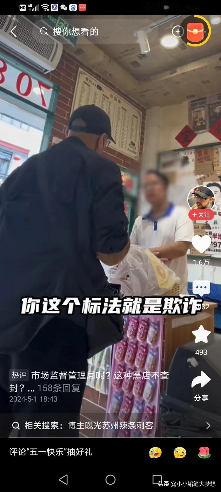 又是一种新型的套路,普通的辣条卖85一斤!!这是玩欺诈,玩出了新高度!近日,一位博主曝光苏州的一家店,辣条居然不是按包卖的,是按克卖,不少消费者都中招了! 博主来到了苏州观前街上,看到了一家童年零食店,就进去挑选了一些零食,刚去看的时候发现这里的东西很便宜,辣条0.17一个。 可是再仔细一看,是0.17/克。等他结账的时候,收银员却没有告诉他多少钱,就让他出示二维码,哔的一声之后,他才发现自己的钱被扣了187元,他就对着收银员说,就这点东西,187元吗?你在收钱之前,为什么不主动告诉我多少钱? 收跟员人却无辜的说:“你又没问我,我忘了!” 这位博主说:“你在刷我二维码的时候,你应该告诉我多少钱,这是一个正常的操作模式。” 这时候旁边另外一个服务员就说把小票给他! 博主看到了这个小票之后,惊讶了,问他多少钱一斤? 收银员说85/斤,明码标价。 博主说你这个东西又不是人参,铁皮石斛,居然按克来算,而且这个标间那个克字还写的很小,故意离得很远写,这是误导别人!而且这个东西是辣条啊,就是面粉刷辣粉,咋就能卖85一斤? 这个收银员居然说,这里的房子一年租金还好几百万。 博主反怼他说:“你这个东西就值这个钱,你再贵,你也卖不出,你们这是欺诈行为!而且你们结算的时候还故意不报金额,有一些人不注意,刷了就走,有一些人带女朋友来的,刷了才知道花这么多钱,也不好意思提出来!这真是骗出了新高度了! 众所周知,大家的认知就是辣条都是按包来卖的,这个店家居然还按克来卖,还卖到85一斤,还是故意在标签上搞文章,最后还故意不报价格,就刷二维码,现场还不少消费者中了招。 最后,这位博主把这家店给举报了,这种欺诈消费者的黑店确实要管管呢,不然他们还以为自己无法无天。