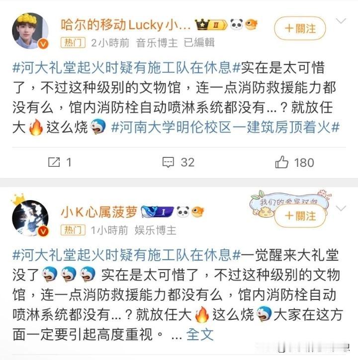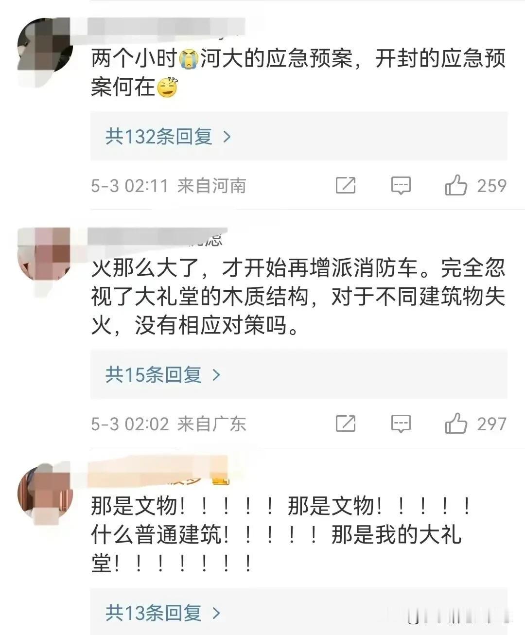 “要搬走,也不能这样彻底吧?”这可是有90年历史建筑物啊,仅两个小时只烧剩个底,网友们发出灵魂拷问:1、河南大学和开封政府的应急预案为什么没启动? 2、明明知道这是木质结构的,还是百年文物,为什么一开始就没考虑到?应该接到火警的时候就可预见性,就应出动多辆消防车前往救援,而不是在救火的过程发现控制不住了,再去增援,一切都迟了! 3、这种国家级文物,里面喷淋系统都没安装吗? 4、要搬走,也不能这样彻底吧? 开封人对这个建筑都有特殊的感情,就像北京故宫在北京人的地位一样,近百年的文物,我想任何人看到了,都觉得惋惜,因为最无法容忍看不得的是古建筑变成了废墟,何止是可惜伤心可言喻的! 网友提出来的问题也不是全无道理,确实应该要好好查一查,无论什么原因,国家级文物,文物不可再生,毁在谁手,都将成为千古罪人! 必须严查起火原因。