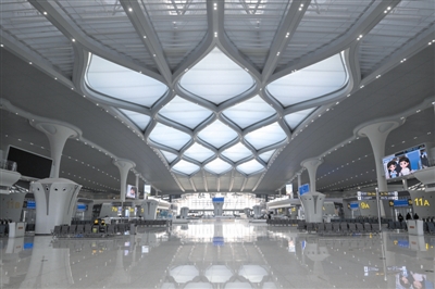 室内设计以大湖、科技为统领,融入大湖水波、科技脉动与现代徽派三大主题文化元素,水滴、芯片、青莲等装饰元素依空间特性有序分布彰显空间文化底蕴与时代精神;高架候车厅“水滴天窗”面积达1.04万平方米,单体长35米,采用大跨度连续双曲面铝板、Low-E中空玻璃及渐变水蓝色遮阳膜,兼顾采光、遮阳、防尘与排烟功能;“水滴天窗”则通过第五立面泛光照明模拟巢湖夜景水光,巧妙融入地域文化元素,点亮城市天际线。
