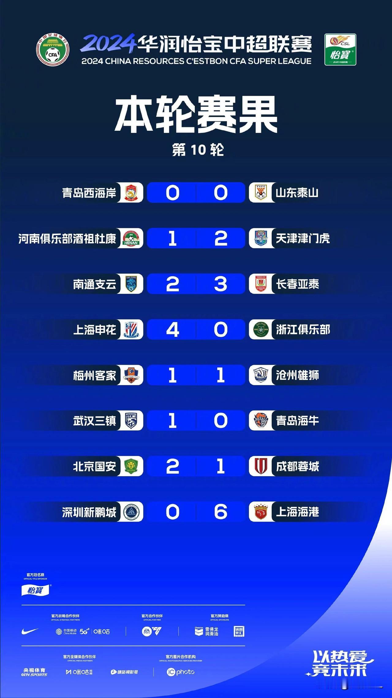 中超10轮过后,大局基本已定: 联赛冠军:上海申花55%,上海海港45%。