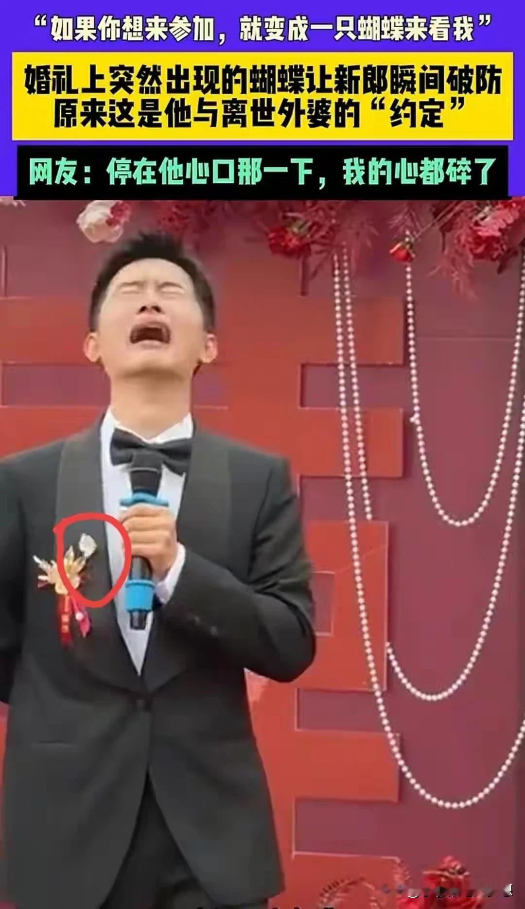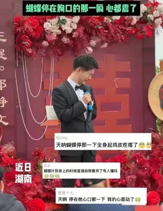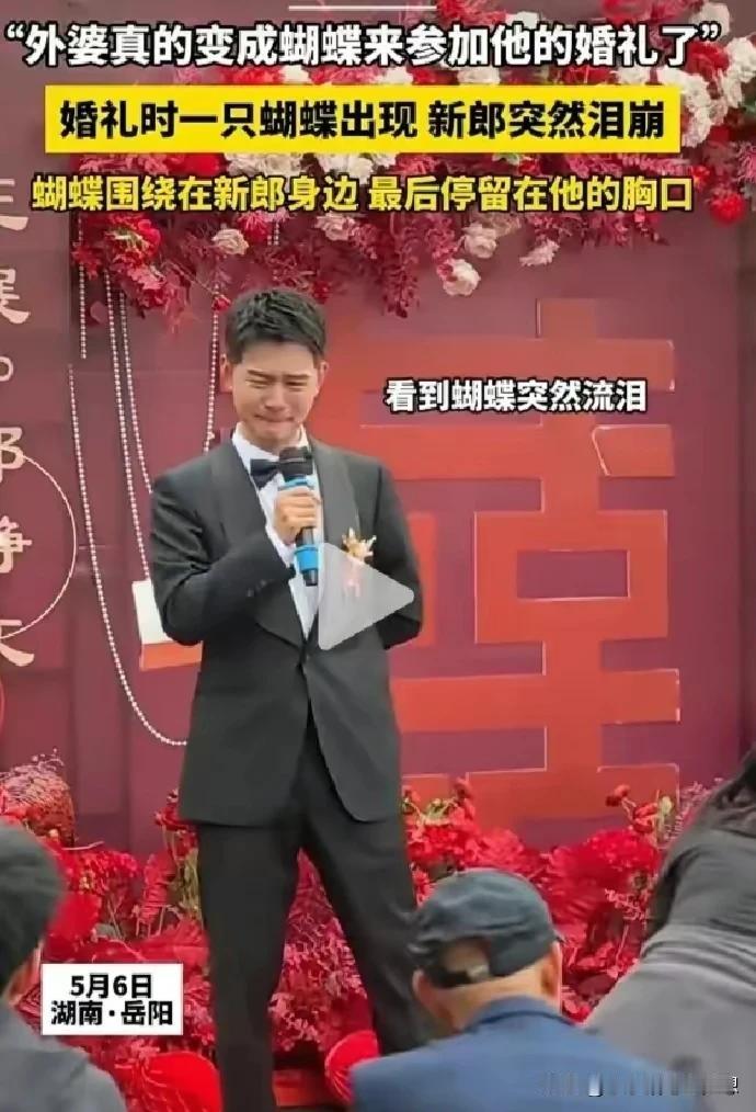 有一些东西真的连科学都解释不了!湖南岳阳的一名男子在结婚前一个星期给死去的外婆发去的信息“如果你想来参加我的婚礼,可以化成一只蝴蝶落在我的肩膀上……” 结果婚礼当天,他在台上致辞的时候说到了外婆,说自己特别怀念外婆,希望她能参加自己的婚礼,没想到就在这个契机,有一只蝴蝶真的飞了过来,而且落在他的胸前,久久没有离去,男子看到蝴蝶停在自己胸前的那一刻崩溃大哭,因为他外婆真的收到他的信息了,真的来见证他的幸福了! 新郎从小就跟外婆的感情很好,去年他外婆去世了,今年他准备要结婚了,所以就给外婆发去了信息,说好想邀请她来参加自己的婚礼,如果外婆还健在的话,一定是跟着妈妈在忙前忙后了,如果外婆婆你想来参加我的婚礼,那你就化成一只蝴蝶落在我的肩膀上吧,这样我就知道你来看我了,记得多停留一会儿……… 有的时候真的科学都解释不了这种的事情,但凡家里有只蝴蝶飞来,我都会联想己故的亲人!