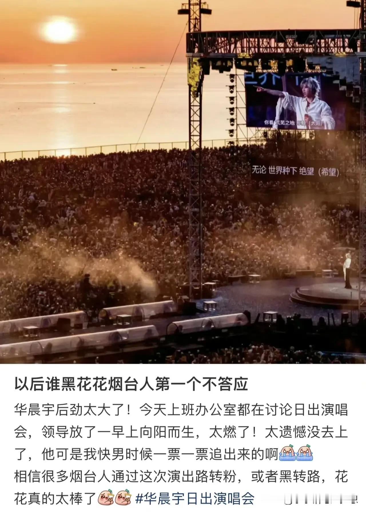 说他癫嘛,这个演唱会确实成功,华晨宇的三点钟的日出演唱会,连人民文娱都大大夸赞他,在山东烟台海边废弃用地搞起了基建,在这里重新修路,老旧设备翻新,还细致的清理了沙滩的垃圾和锋利的石头,为了把握好日出的观赏效果,踩点日出30多次,从选址到筹备至今一共用了800多天,这么用心是因为这个火星演唱会已经举办第十个周年了,几万人同时看日出,不得不说真的有创意! 而且,在他演唱会还有几首歌要结束的时候,他把那些抢不到票的粉丝全部放了进来,让他们一起来观赏日出,然后他唱起了《向阳而生》,不得不说,虽然没到现场,但是看传回来的视频确实很震撼!
