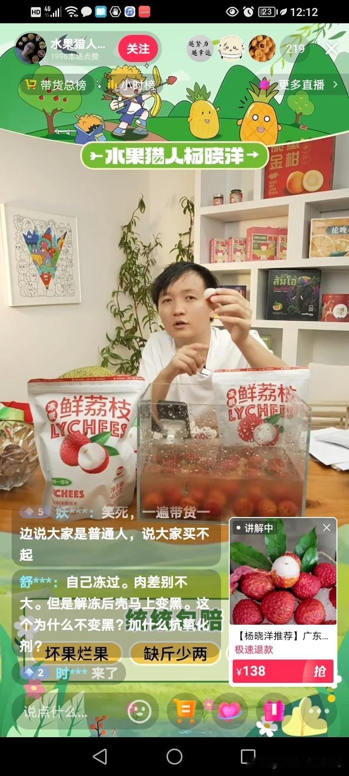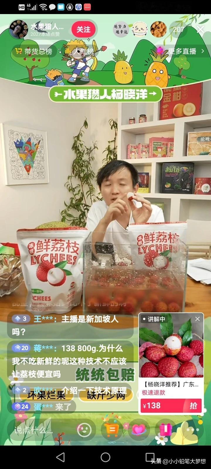 广东冻眠荔枝上市,水果猎人杨晓洋首次开启冻眠荔枝的直播,可价格贵的吓人!评论区都说他招黑,而他自己也说普通人就不要买了,真的不建议买,确实挺贵! 可不是嘛,800克卖138块钱,他说今年的广东天气荔枝肯定减产,去年是大年,今年的荔枝是小年,再加上受冰雹的影响,家里的果园,桂味根本没挂多少果,可以说差不多颗粒无收。 他说这是去年6月,广东运用超低温冻眠锁鲜技术,保存了二三百吨新鲜采摘的荔枝,现在已经开售了,这一项技术是有科学含量的,跟自己冻的完全不一样。 我们自己冻的是会发黑,解冻完就已经没有那个鲜味,而且还是水水的,不晶莹剔透了。 他说,这项技术就像冬眠一样,醒过来了之后荔枝的色香味还原90%,不但颜色没变,剥开来的果肉还是晶莹剔透,跟新鲜的口感差不了多少。 网友说的没错,你就算你吹的天花龙凤,冬眠的就是比不上新鲜的,我又不是傻子,就算今年减产,但也不可能卖到100多块钱一斤吧? 你们会买这样的荔枝吗?