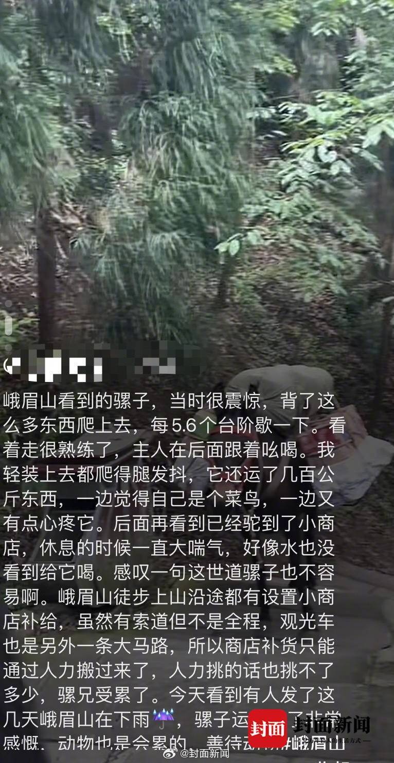 同时,相关负责人表示,网络上反复出现的一张,骡子因背负重物导致膝盖、眼角等部位出血的图片,不是在峨眉山拍摄的。“目前,视频中的骡子健康状况良好。”