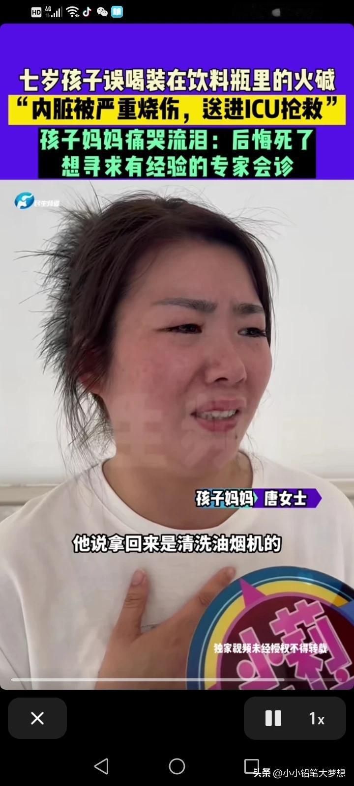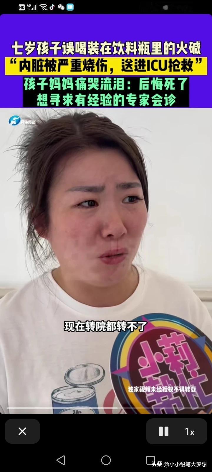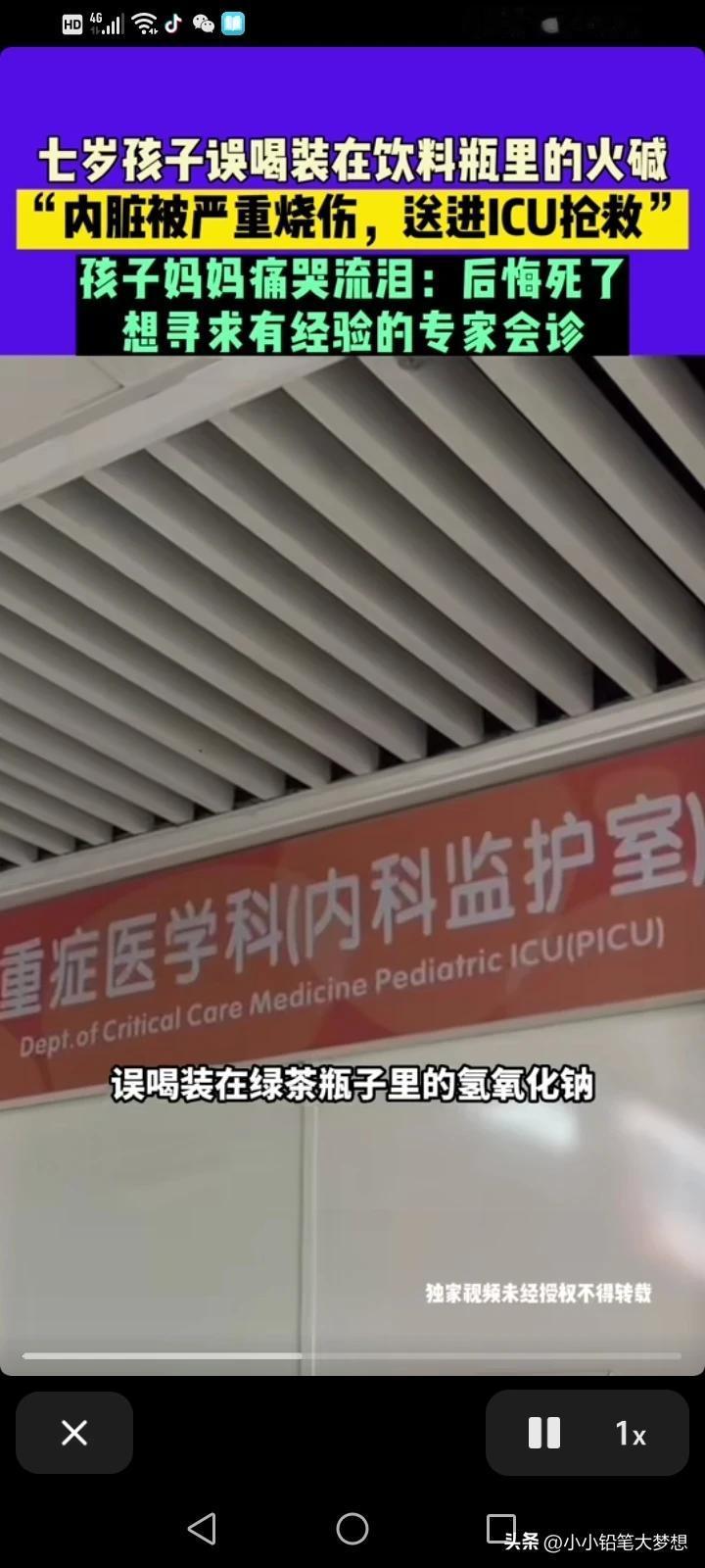 唉,真的太让人心痛,因为父母的大意,把孩子整进了ICU,现在无奈要向媒体求助,看看有没有相关的专家可以治疗!孩子误喝了装在绿茶瓶里的氢氧化钠也叫做火碱。 这瓶火碱是家里人带回家的,别人告诉他这个洗抽油烟机特别好用,但是他把这个东西随手放在桌子上了,结果七岁的孩子打开就喝了。 这位妈妈说后悔死了。 导致从舌头整个食道,胃肠,气管甚至到了12指肠都被烧伤,里面全都碳化了,孩子吐出来的东西都是咖啡色。现在在河南郑州儿童医院的ICU里面,情况很不好,也转不了院,所以这位妈妈只能向媒体求助,看有没有治疗这方面的专家来到他们这家医院一同会诊。 火碱这个东西腐蚀性太强了,使用的时候要特别小心,有些人用它通马桶,用热水后会剧烈反应会喷溅出来,之前看有个人就是这样用,溅到眼睛里了,最后导致失明,平常使用的时候用手摸一下都烧的不行,这如果这孩子喝的少的话,轻的可能喉咙食道都无法吞咽了,按妈妈这样子说,孩子烧的真的很严重了,可能内脏都腐蚀了。 所以家长朋友千万不要用饮料瓶装有害物质放家里,小孩子就是特别喜欢喝饮料,都要注意这些问题,太可怜了!