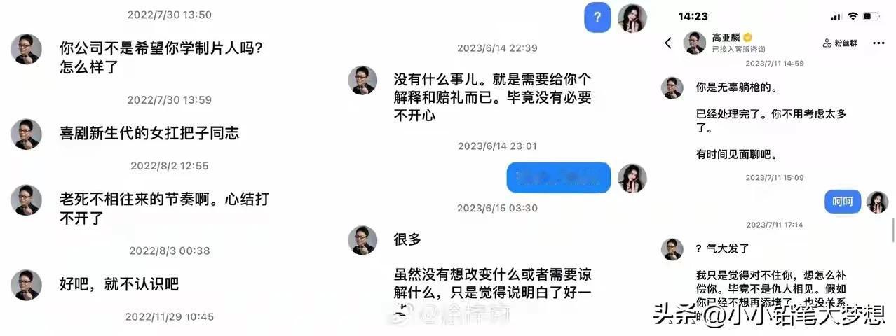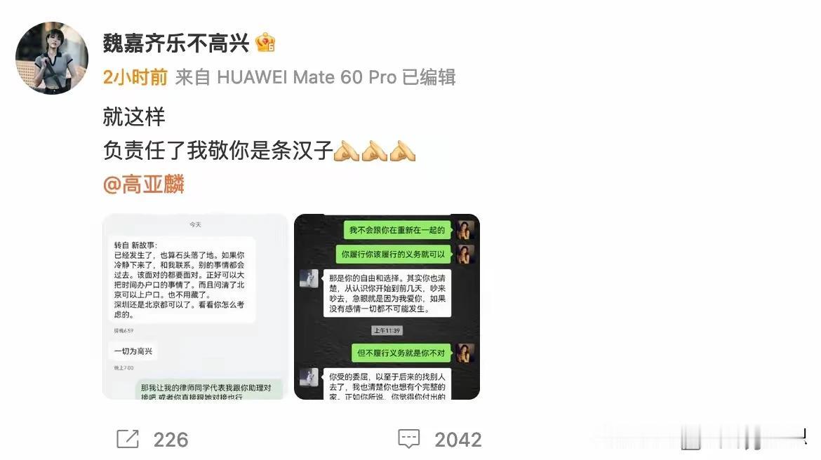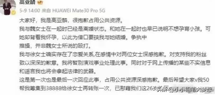 高亚麟和魏嘉闹了几天终于谈妥了,而姓徐的女演员终于发声了,这件事看下来,真的最倒霉就是她了,被人家贴上了那么一个标签,现在连工作也停了。 姓高的这样的话也说的出来,你在这个圈子里面有资本,人家是一个小演员,只想在娱乐圈讨点生活而已,而且是你追的人家,人家想得到一个工作的机会,所以肯定会笑脸相迎啊,但是到头来,你为了维护自己的形象,却说人家是鸡。 魏嘉为啥要把徐露出来啊,直接艾特人家,基本是当着全国人的面打脸的感觉,心理承受力好的还好,差的会出人命的,还有人父母,知道自己养大女儿被这样骂也会疯的, 把网友当枪使,为了达到自身的目的,还非得祸害另一个女的,现在弄得人家身败名裂。唉!!