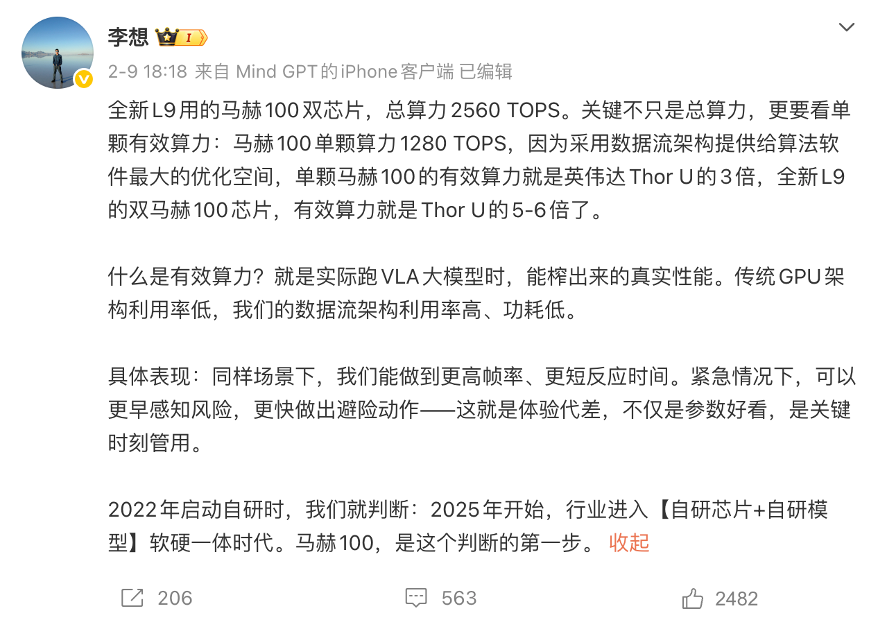 2026年,理想将推出搭载自研智驾芯片M100的车型。其中全新理想L9将搭载双M100芯片,总算力高达2560 TOPS。值得注意的是,理想汽车CEO李想称,因为采用数据流架构提供给算法软件最大的优化空间,单颗M100的有效算力是Thor U的3倍,全新L9的双M100芯片,有效算力是Thor U的5-6倍。