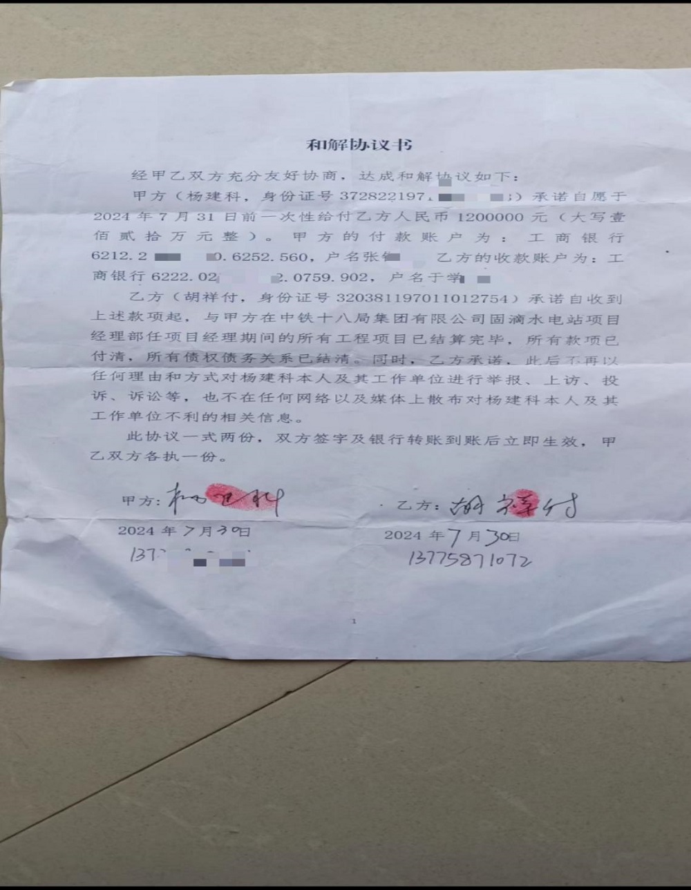 2024年7月22日晚上,杨建科主动联系胡祥付,代表十八局面谈,希望胡祥付不要再四处上访、举报,商谈给胡祥付120万,之前反映的一切事以及工程款的问题一笔勾销,并让胡以后不要再举报他,随后杨建科与胡祥付签署和解协议。