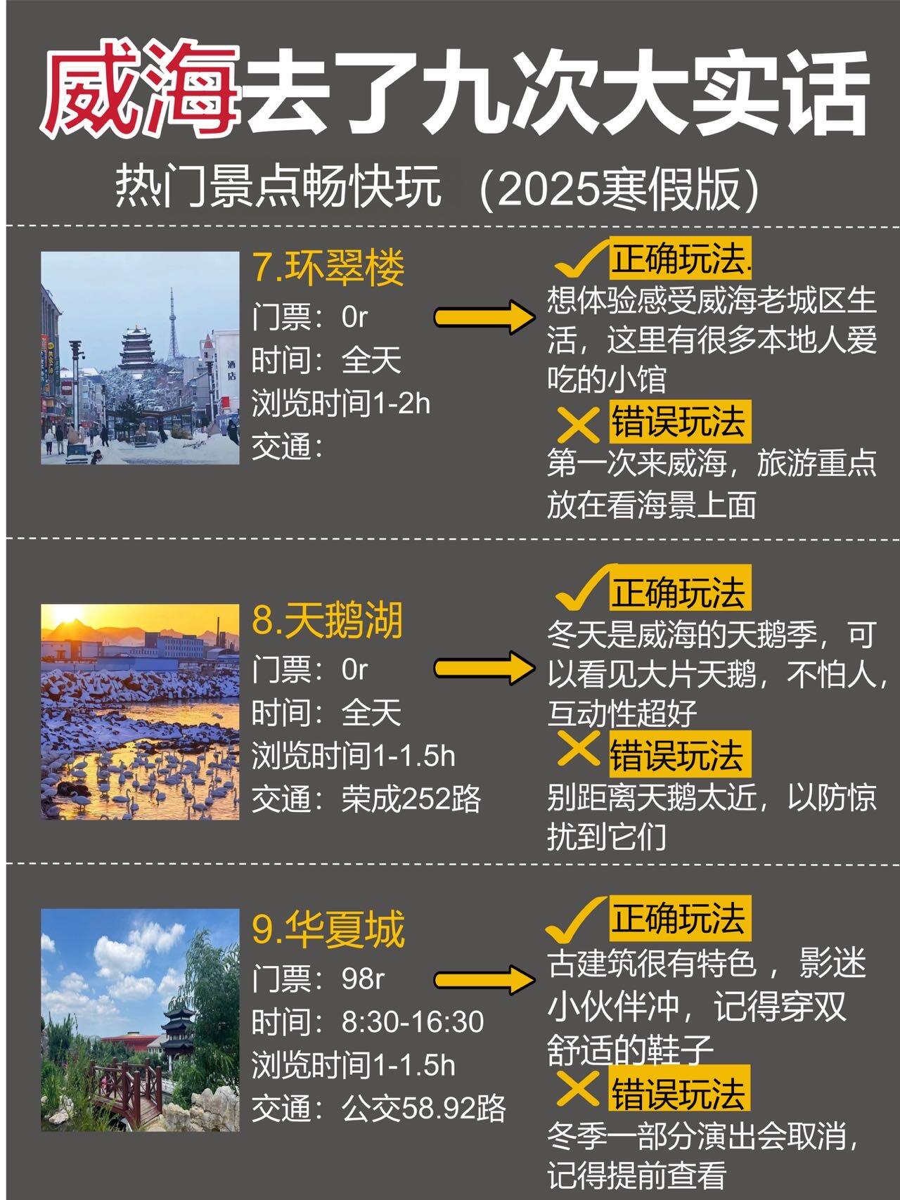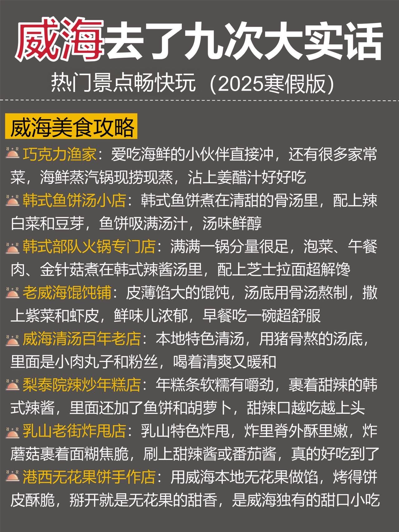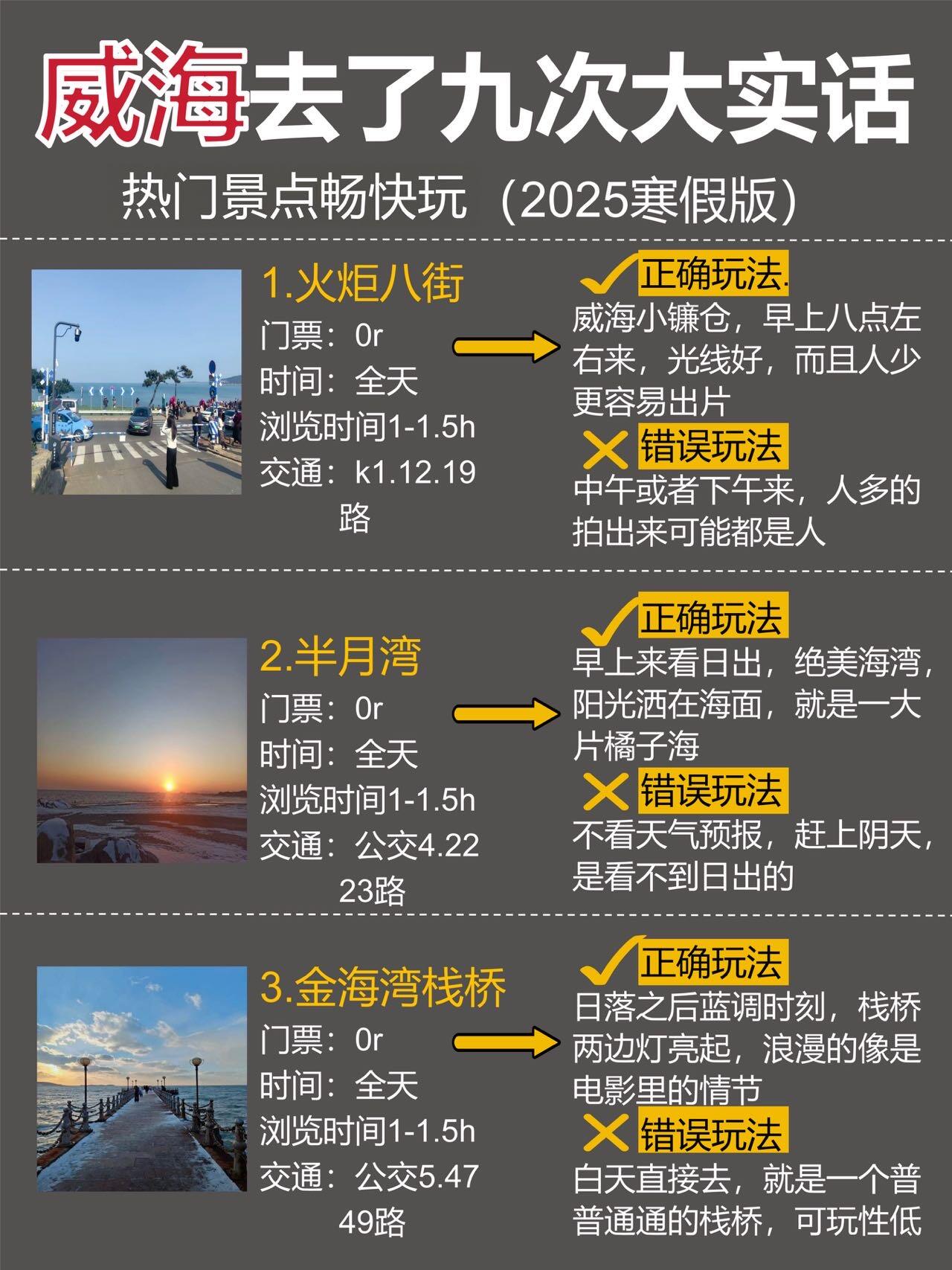 ✍️威海北站下车,行李🧳库存好,直接冲去火炬八街,到的时候刚八点🕗,人不多,拍照📷嘎嘎出片。溜达去国际海水浴场吹吹海风,有点冷🥶。下一站金沙滩,我们去找了栈桥,我想蓝调时刻亮灯💡会很美了。接着去了猫头山,观景台有好多,推荐二号和三号,视角很棒。下一站半月湾,喜欢清静小伙伴冲,比市区沙滩干净🤓。