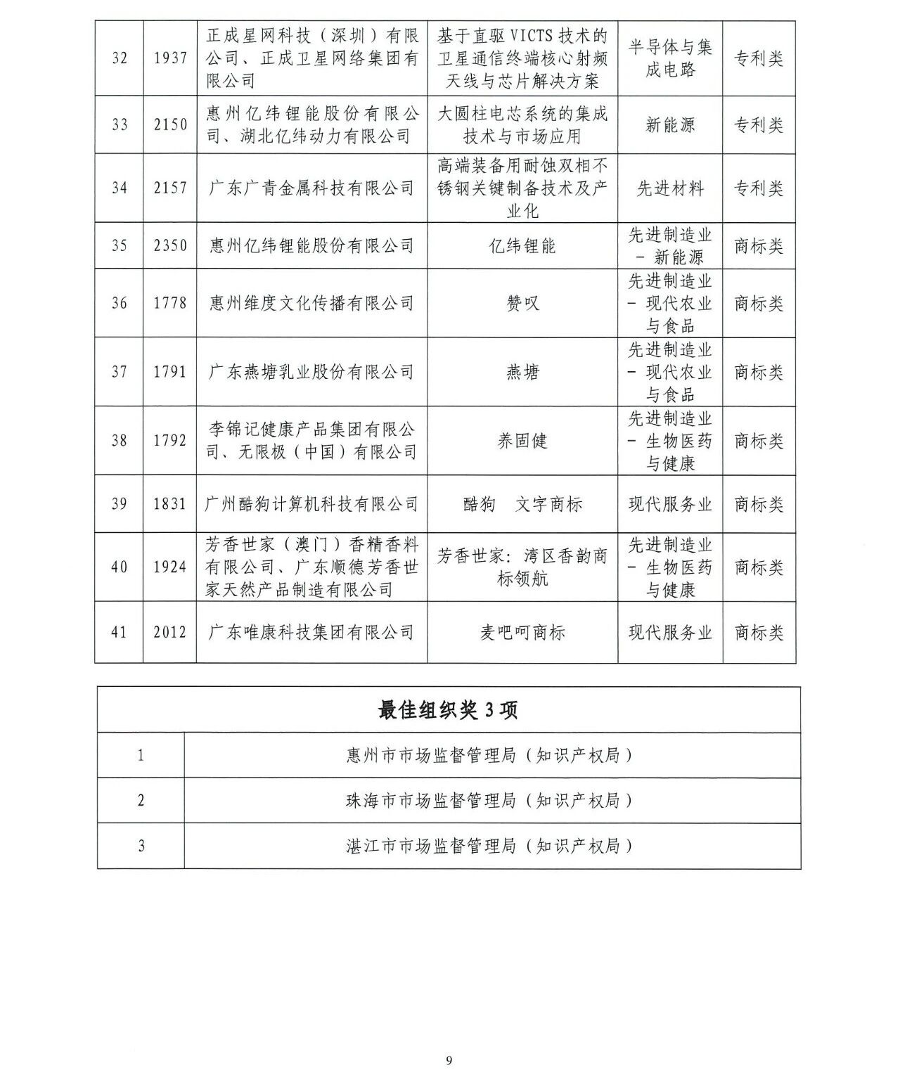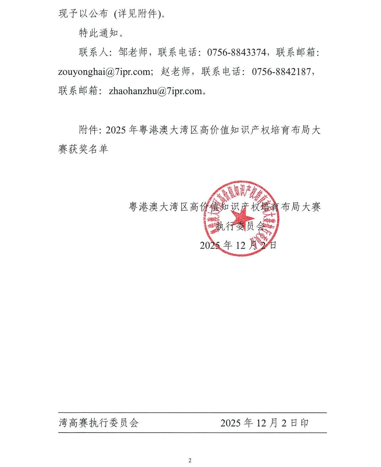 根据《广东省市场监督管理局关于印发2025年粤港澳大湾区高价值知识产权培育布局大赛工作方案的通知》,依据公平、公正、公开的原则,经过初赛、决赛,大赛最终决出金奖10项、银奖20项、优秀奖31项(含分数并列项目),转化运用奖20项、投资潜力奖21项(含分数并列项目),为激励省内各市局对湾高赛的支持,设立最佳组织奖3项,现予以公布(详见下图)。