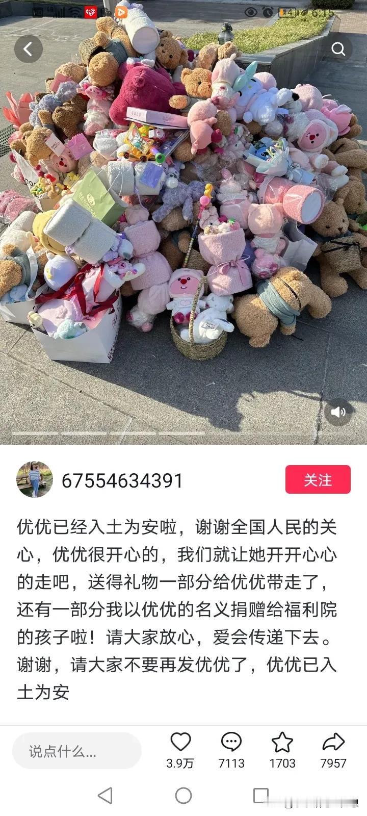 南通车祸造成死亡的小女孩已经火化入土为安了,从大屏上显示优优是今天早上八点多的时候进的火化炉,妈妈发文说:谢谢全国朋友的关心,优优很开心,我们让他开开心心的走吧,大家送的礼物,有一部分给优优带走,有一部分她以优优的名义捐给了福利院~ 生活还要继续,因为她还有一个孩子,因为她还有一份体面的工作,宝贝也要入土为安,不可能一直僵持着不解决,很理解优优妈妈的处境,她或许已经累了,这几天她肯定是硬撑着的,表面看上去很坚强,事实可能真的是遍体鳞伤! 说实话,就算赔偿多少钱,我想没有任何一个妈妈想要用孩子换钱的,钱可以再挣,孩子的生命是不可能用钱换回来的,但是生活还得继续啊,她还有家人,只希望优优的父母坚强活下去,保重身体,优优宝贝,一路走好。