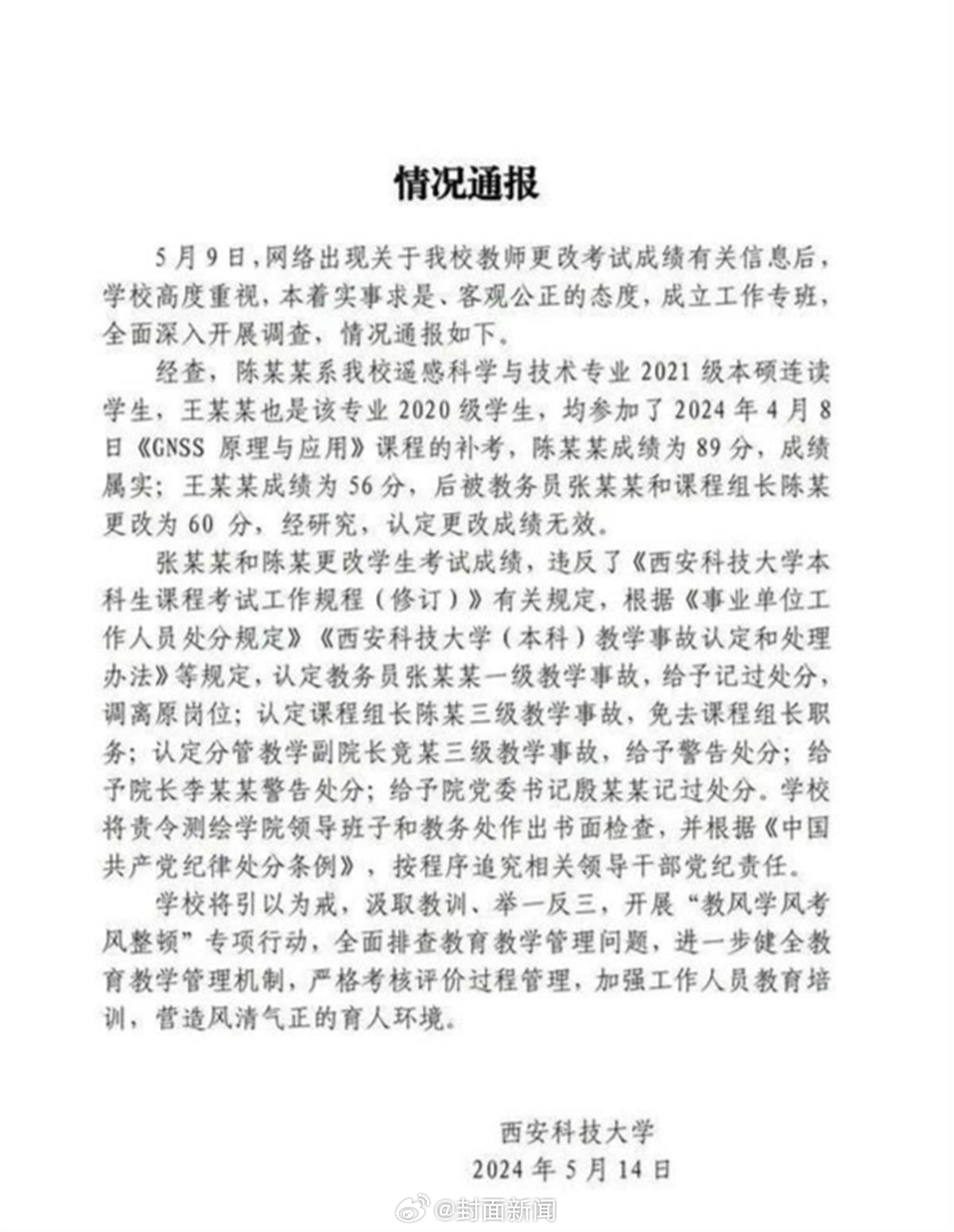 【#媒体四问西安科大改成绩事件#】近日,西安科技大学“教师更改考试成绩”一事引发关注。5月14日,西安科技大学发布情况通报:#西安科大改成绩事件多人被处分#。但同时,这一事件仍有一些问题尚未厘清。其一,挂科学生陈某某的家长,究竟是什么人?其二,任课老师拒绝修改成绩后,补考由其他老师出题和阅卷,而陈某某就考过了,这样的操作合规吗?其三,现在王某某被修改后的成绩无效了,他的研究生还能继续上吗?其四,涉事教师在学院还能认真教书吗?(工人日报、极目新闻)