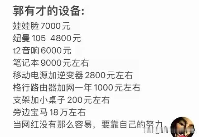 郭有才的装备确实挺牛,我特意去听了他的歌,那个声卡就打败了99%的主播了,再加上其他的人设,背景,故事和幕后推手那就变得更有意思! 首先,他的歌曲都是老歌,穿衣也是怀旧风格,其次,他又有一个草根逆袭的故事,坚持唱歌的梦想还努力的生活,经营自己的烧烤摊,当然,必不可少的,肯定是有团队和幕后的推手咯……