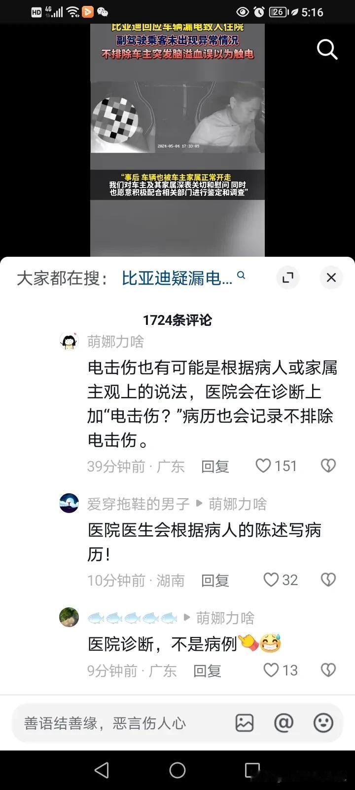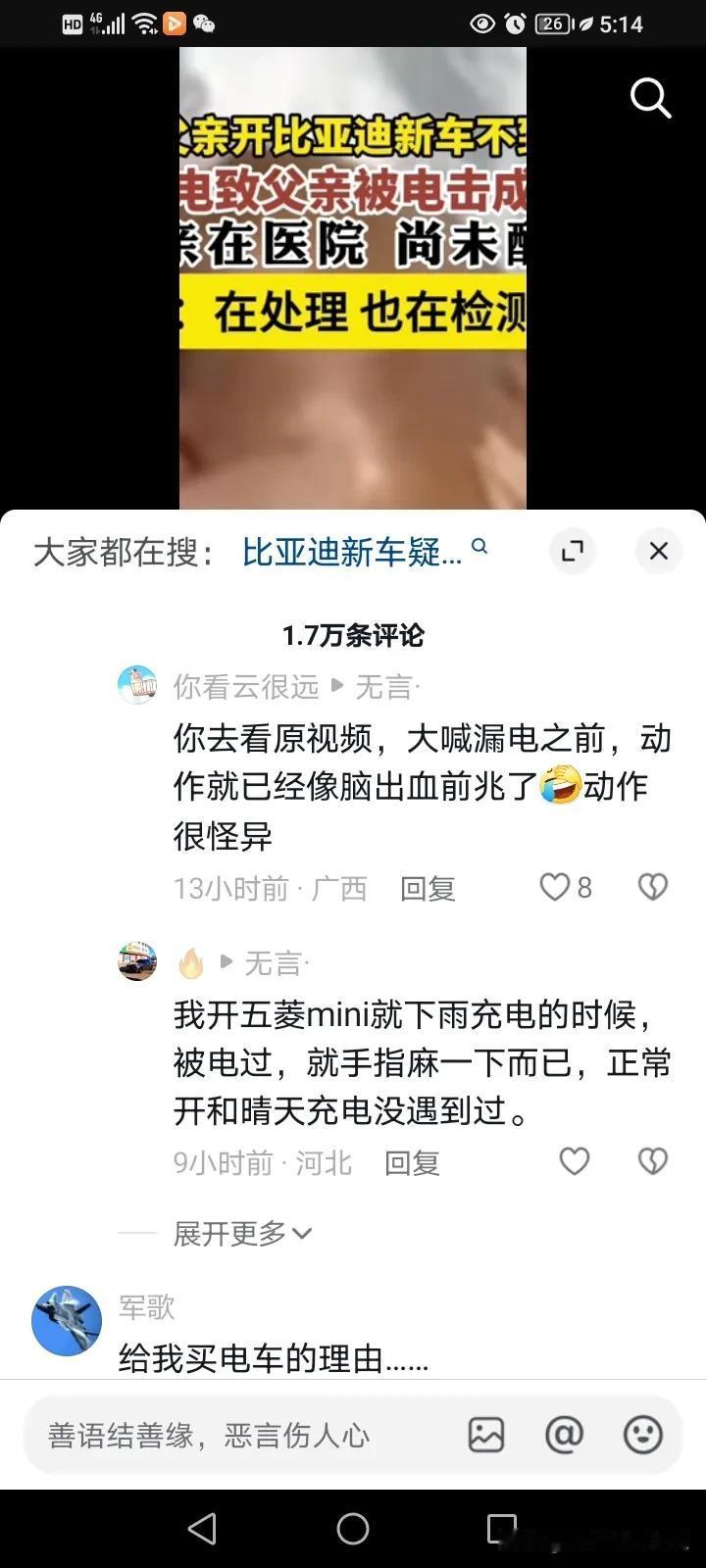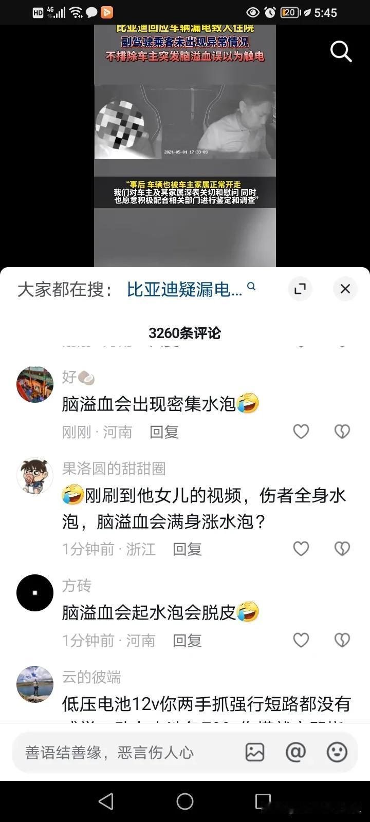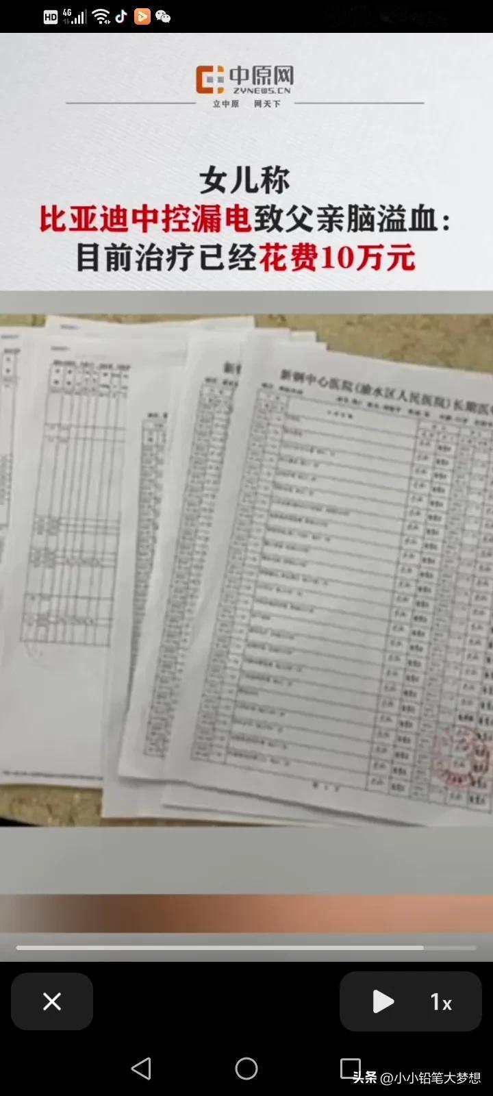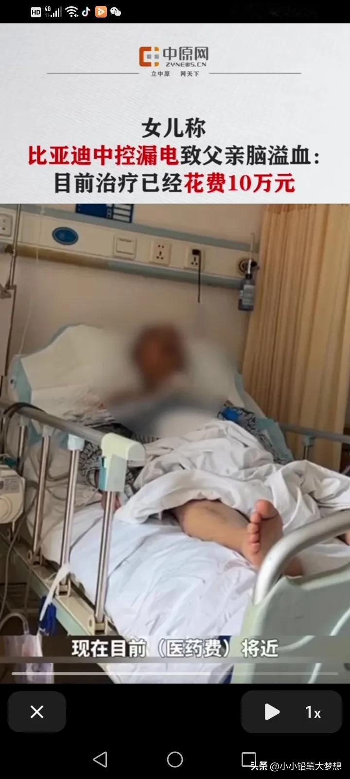 真是离了大谱了!比亚迪漏电造成脑溢血?很理解家属,因为家里的顶梁柱进了ICU的心情,但问题是不能讹呀,有点常识都觉得这是不可能的事情,车内的东西都是绝缘物体,而且车内的电压也只有12伏,又不是高压,怎么会把人变成脑溢血呢? 而且脑溢血的人,他的前兆就是有手脚麻木的症状,家属说在车内被电了六次,这是更奇葩了,至于所说的诊断证明,那是家属自述的原话,至于所谓的水泡,脑溢血的人肩膀上都会长水泡的。 比亚迪的声明其实也说的很清楚了,虽然家属住院花了十万多块钱,但是实事求是,是漏电还是自身疾病问题? 如果家属还觉得不可以接受的话,那可以由第三方来检测这辆车到底有没有问题! 我有点不理解,怎么会把这个事情闹得这么大呢?不知道背后有没有推手……