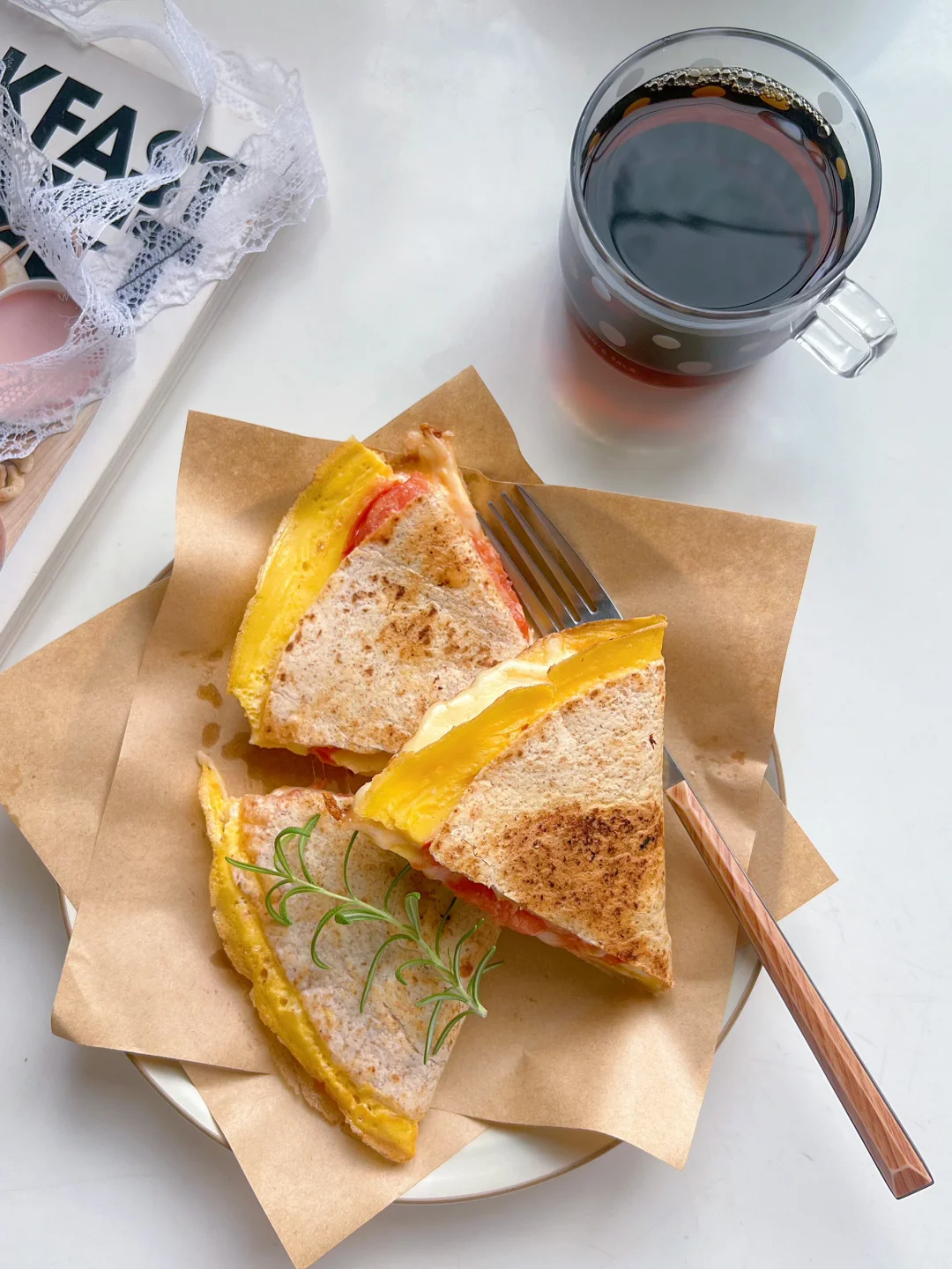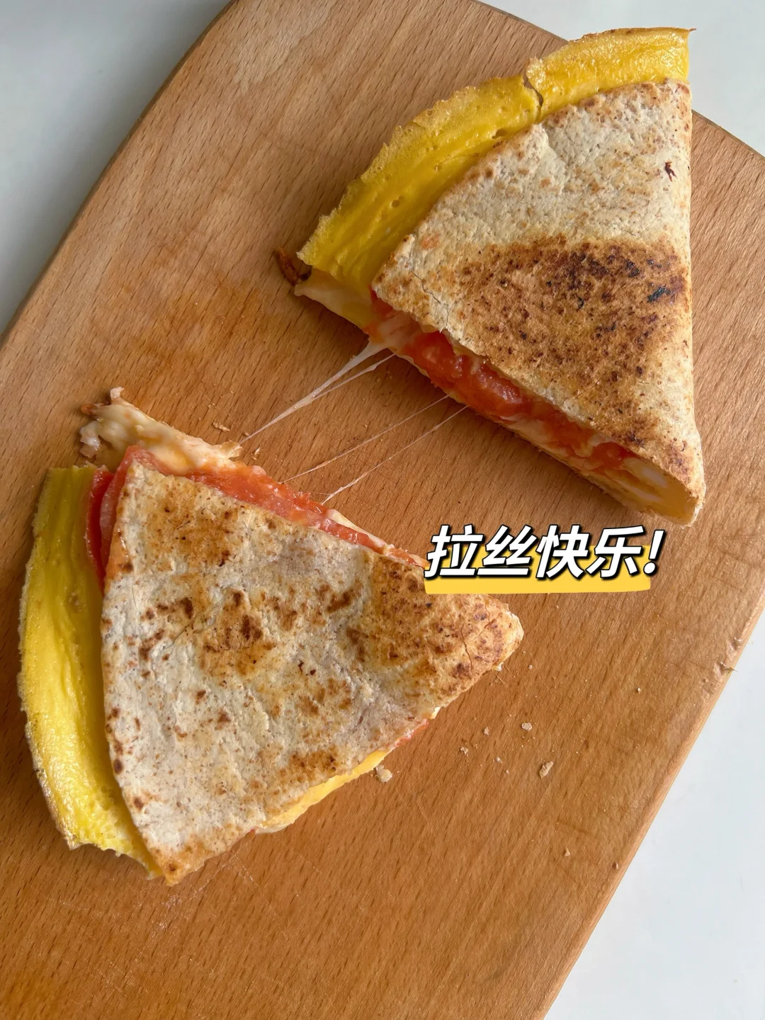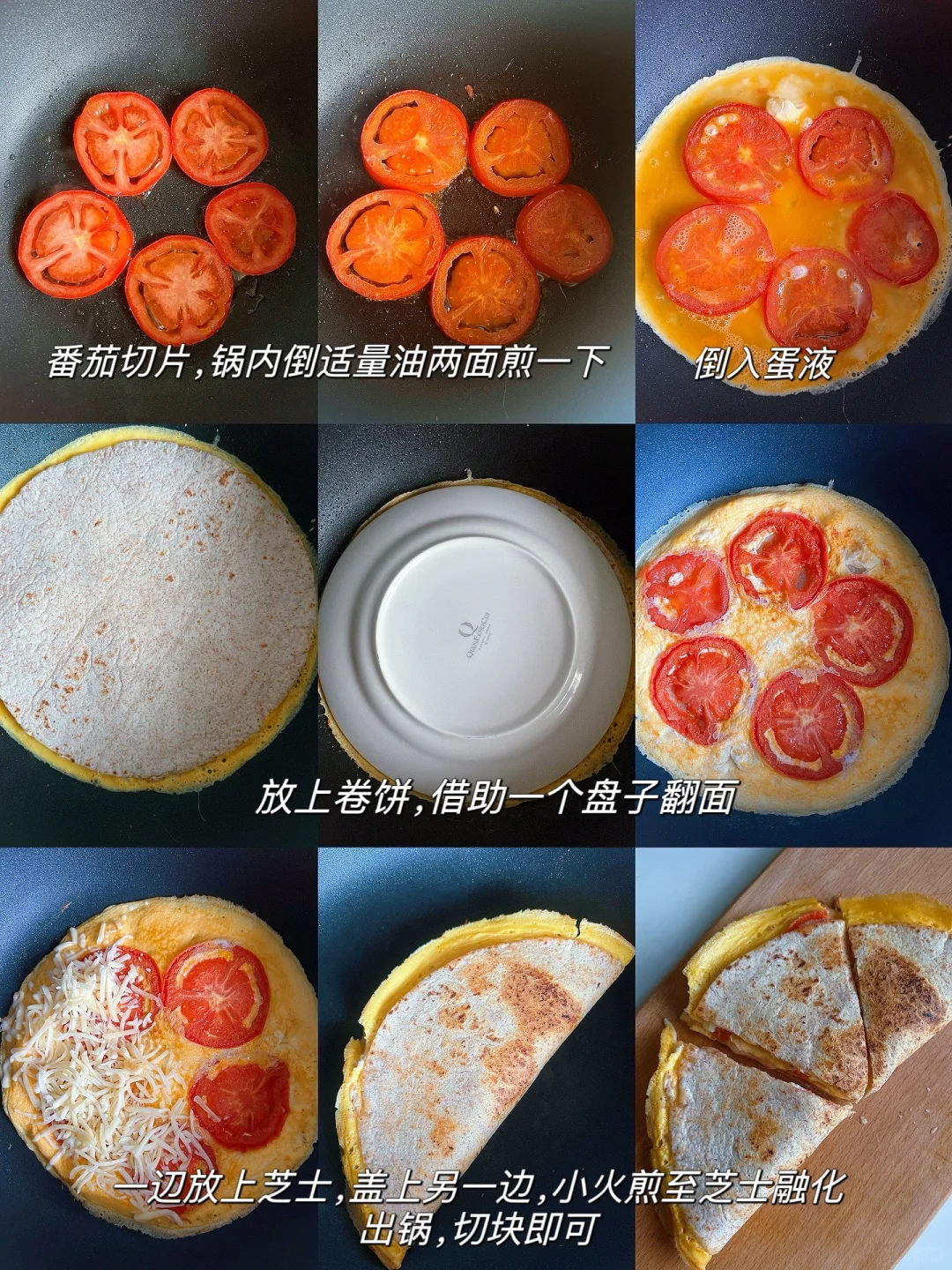 今天的早餐长这样 好久不吃卷饼啦 就做一个好吃又低卡的番茄鸡蛋芝士卷饼吧 必须趁热吃哦!太!好!吃!啦!! 👉 食材: 番茄1个 鸡蛋2个 全麦卷饼1张 芝士碎适量 步骤: 1️⃣番茄切片、两个鸡蛋加适量盐打散备用 2️⃣锅内倒适量油两面煎一下 3️⃣倒入蛋液,放上卷饼,借助一个盘子翻面煎一会 4️⃣一边放上芝士碎,盖上另一边,小火煎至芝士融化即可