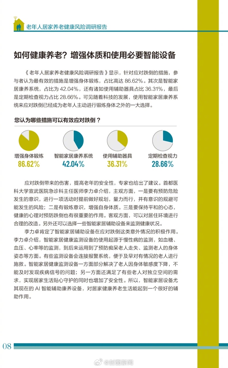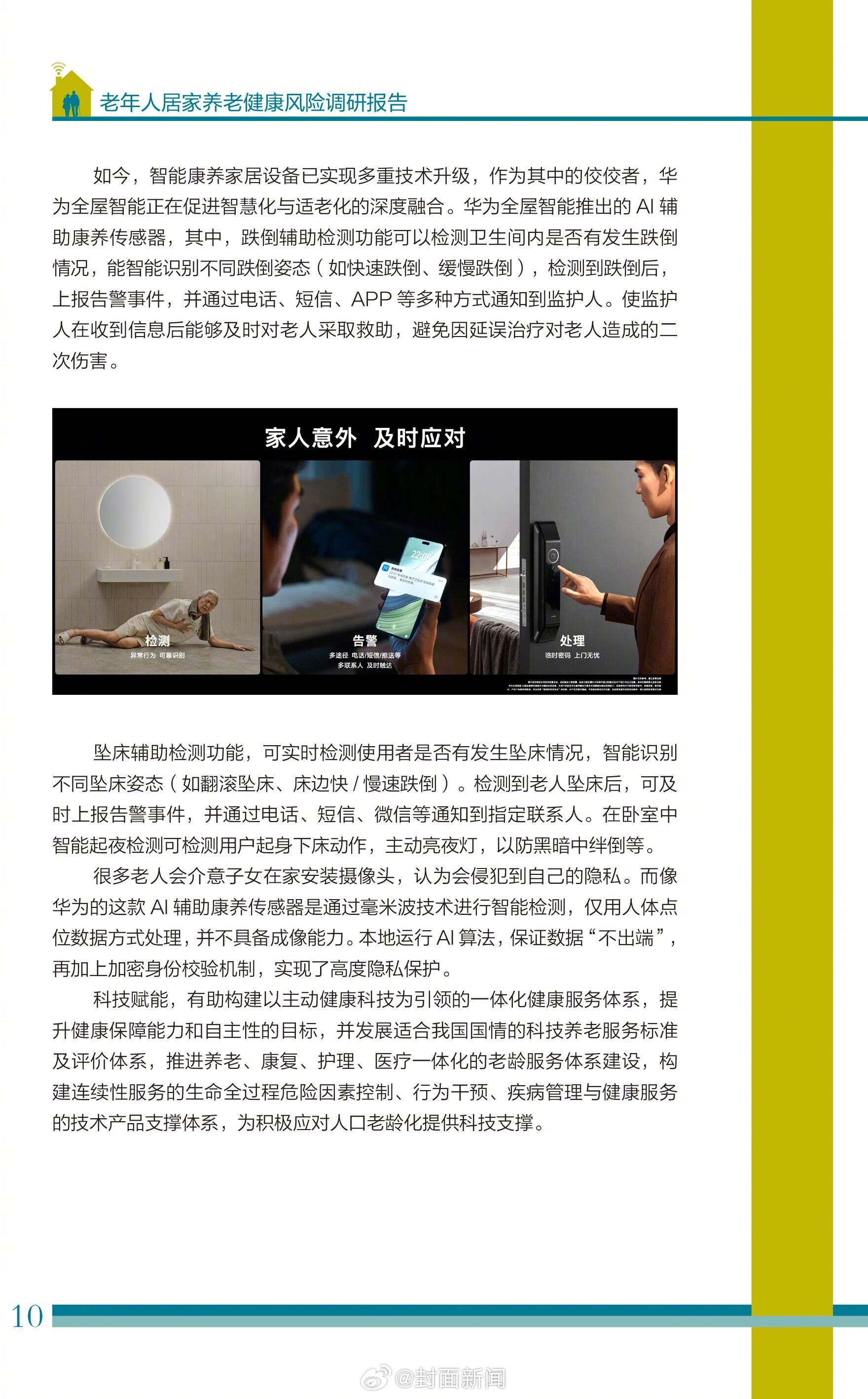【注意!!#跌倒已成独居老年人最大安全隐患#,我们该如何防范?】卫健委数据表明,65岁及以上老年人跌倒死亡发生率为58.03/10万,是老年人首位伤害性死因,可称之为“头号杀手”。#如何解决父母居家养老安全隐患#?老年人跌倒的防范是亟待解决的问题,智能科技正在发挥作用。《经济观察报》发布的调研报告显示, 73.25%的受访者表示愿意使用智能家居设备检测突发风险或跌倒。华为全屋智能全新发布的AI辅助康养传感器不仅能够智能检测老人在家跌倒、坠床等风险情况并发送告警信号通知家人,而且它的智能起夜检测还能感应老人起夜并缓亮夜灯,为老人“护航”,减少跌倒情况的发生,是居家养老的贴心小助手。