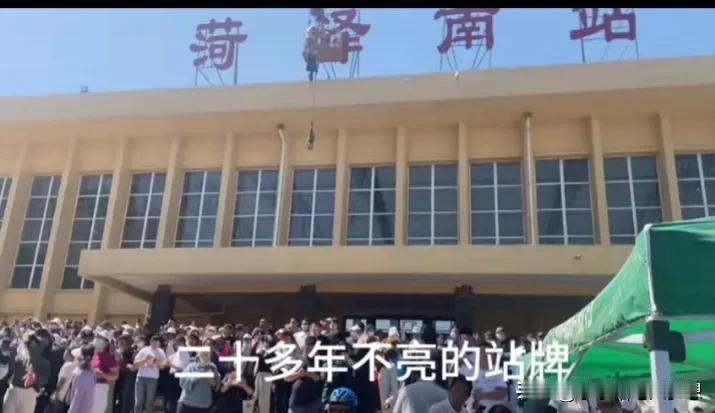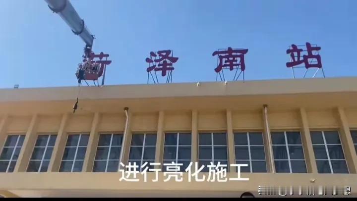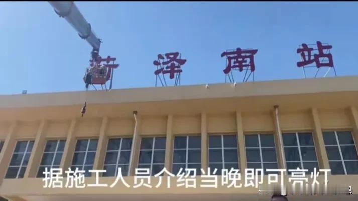 一个人带火一座城市,因为郭有才菏泽南站火了,昨天,有市民建议,这个七几年建的废旧菏泽南站这几个字的灯牌应该要亮,没想到今天就行动了,大吊机把工程人员送上去修复了灯牌的线路,今天晚上真亮灯了,不得不说,这个山东文旅还是很给力的,这速度真的杠杠的,这一波泼天富贵算接住了。 而听说菏泽南站内部的候车厅也已经在整理了,政府说可以让全国各地网红在里面休息,有落脚之地。