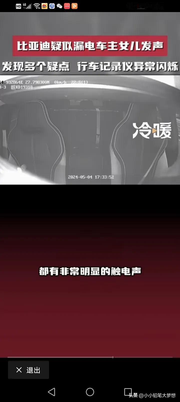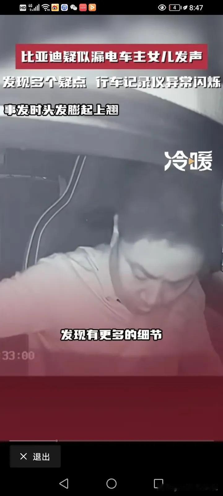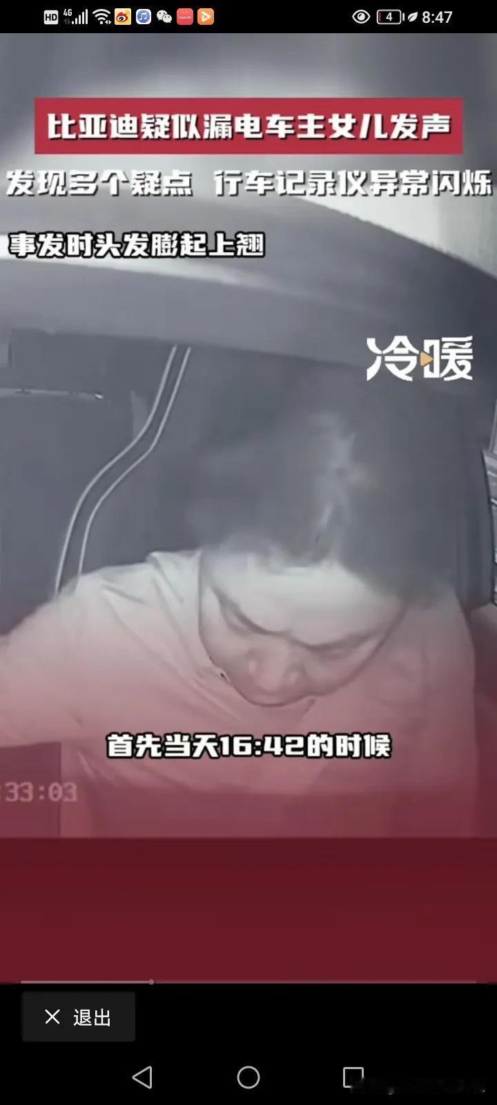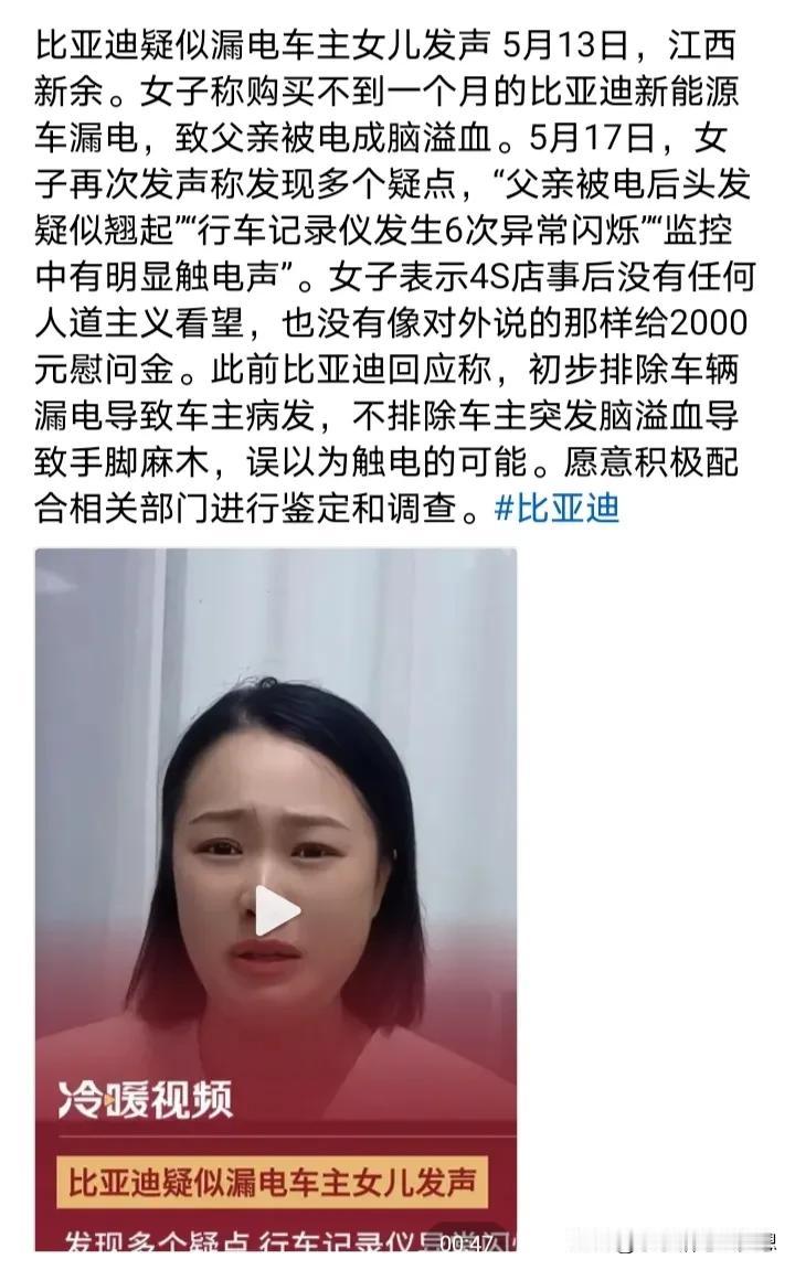 比亚迪疑似漏电造成脑溢血车主的女儿再次发声:反复看了视频,又发现了多个疑点,行车记录仪发现六次异常的闪烁,父亲的头发翘了起来,监控里面还有明显的触电声,监控视频里面父亲有六次触电的动作。 他说,父亲今年51岁,买了他最喜欢的比亚迪不到一个月,准备跑滴滴贴补家用,但没想到的是,开了不到三天就出现了触电的情况,她这几天反复的看了监控视频,发现16点42分08秒的时候记录仪就出现了故障,从原本的彩色变成了黑白的闪烁,然后一共出现了六次闪烁,再恢复成彩色。 17点33分和34分之间就有很明显的触电声。 最令家属寒心的是,事情发生之后,比亚迪说有人过来探望,还给了2000块钱的慰问金,他们根本就没看到人,也没看到钱,比亚迪连最基本的人道主义看望都没! 他们只想得到真相,得到公平的对待! 对于这件事情,我就纳闷了,车内的东西都是绝缘物体,我很好奇,他是怎么样同时接触了正负极?而且电车也有漏电保护,车内的电压也只有12伏,高压又不走车内,12伏又怎么会把人变成脑溢血呢?如果是高压,那不是脑溢血,而是人都已经没了。 而且更奇怪的是,车内明明有其他人,为什么只有车主出现毛病,第三者却没问题呢? 记录仪发生闪烁,是不是因为光线的问题,日夜转换的呢? 确实需要一个真相,我觉得家属可以找第三方再一次测试这辆车,到底有没有漏电?谜题就解开了。