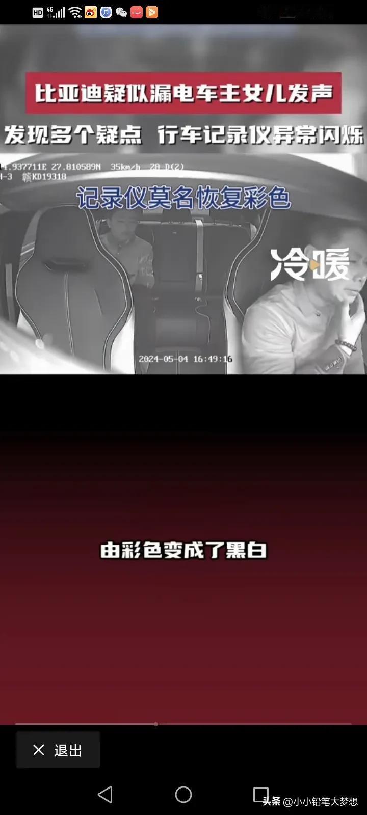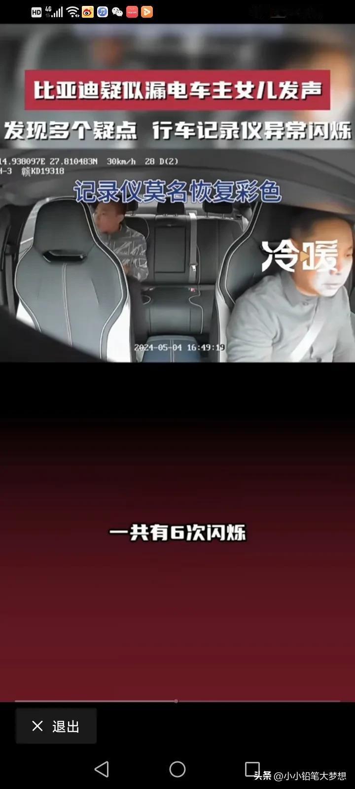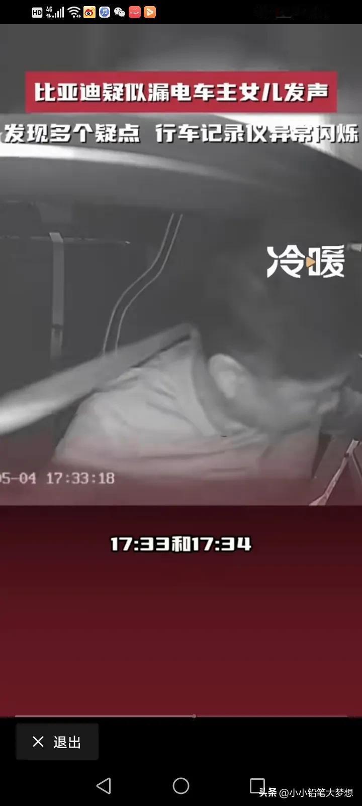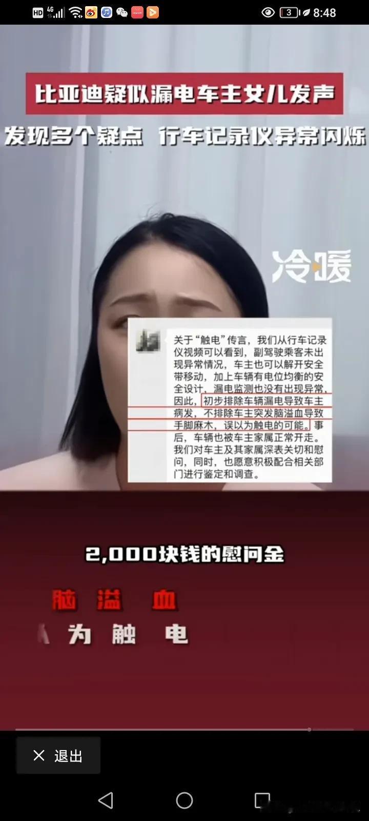 比亚迪疑似漏电造成脑溢血车主的女儿再次发声:反复看了视频,又发现了多个疑点,行车记录仪发现六次异常的闪烁,父亲的头发翘了起来,监控里面还有明显的触电声,监控视频里面父亲有六次触电的动作。 他说,父亲今年51岁,买了他最喜欢的比亚迪不到一个月,准备跑滴滴贴补家用,但没想到的是,开了不到三天就出现了触电的情况,她这几天反复的看了监控视频,发现16点42分08秒的时候记录仪就出现了故障,从原本的彩色变成了黑白的闪烁,然后一共出现了六次闪烁,再恢复成彩色。 17点33分和34分之间就有很明显的触电声。 最令家属寒心的是,事情发生之后,比亚迪说有人过来探望,还给了2000块钱的慰问金,他们根本就没看到人,也没看到钱,比亚迪连最基本的人道主义看望都没! 他们只想得到真相,得到公平的对待! 对于这件事情,我就纳闷了,车内的东西都是绝缘物体,我很好奇,他是怎么样同时接触了正负极?而且电车也有漏电保护,车内的电压也只有12伏,高压又不走车内,12伏又怎么会把人变成脑溢血呢?如果是高压,那不是脑溢血,而是人都已经没了。 而且更奇怪的是,车内明明有其他人,为什么只有车主出现毛病,第三者却没问题呢? 记录仪发生闪烁,是不是因为光线的问题,日夜转换的呢? 确实需要一个真相,我觉得家属可以找第三方再一次测试这辆车,到底有没有漏电?谜题就解开了。