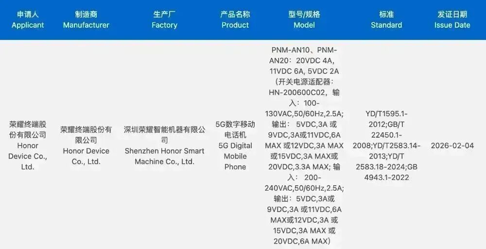 最近的消息还显示,一款型号为 PNM-AN10、PNM-AN20的荣耀旗下新机通过了 3C 认证。其中没有详细的产品系列信息,但推测认为其指的是荣耀 Magic V6 折叠手机。