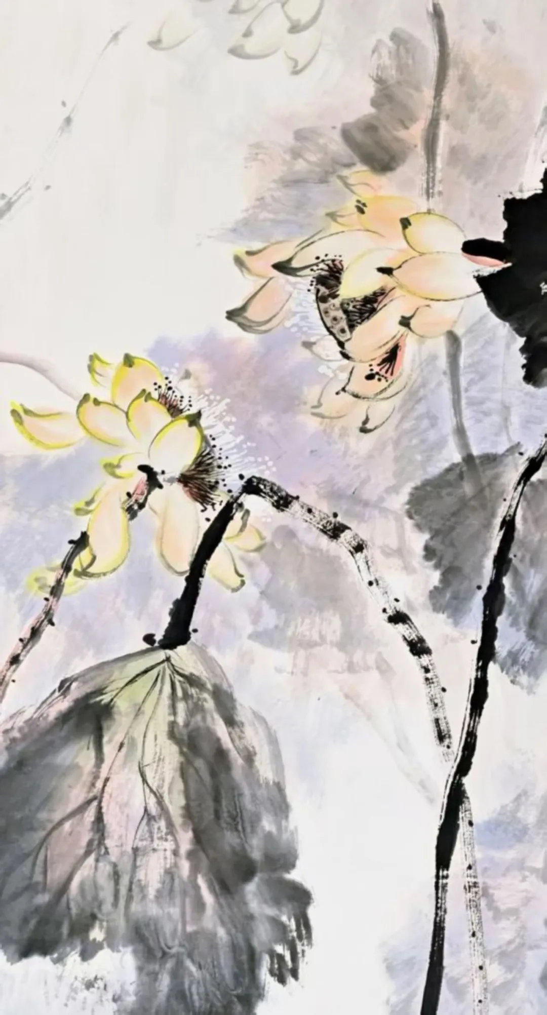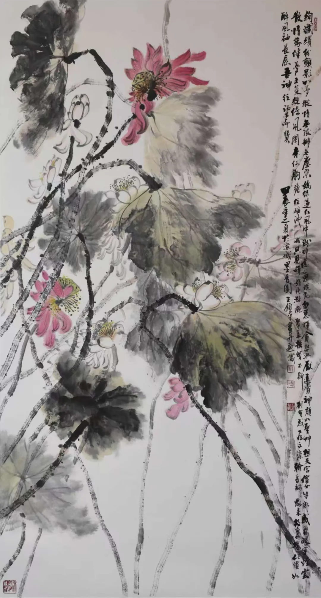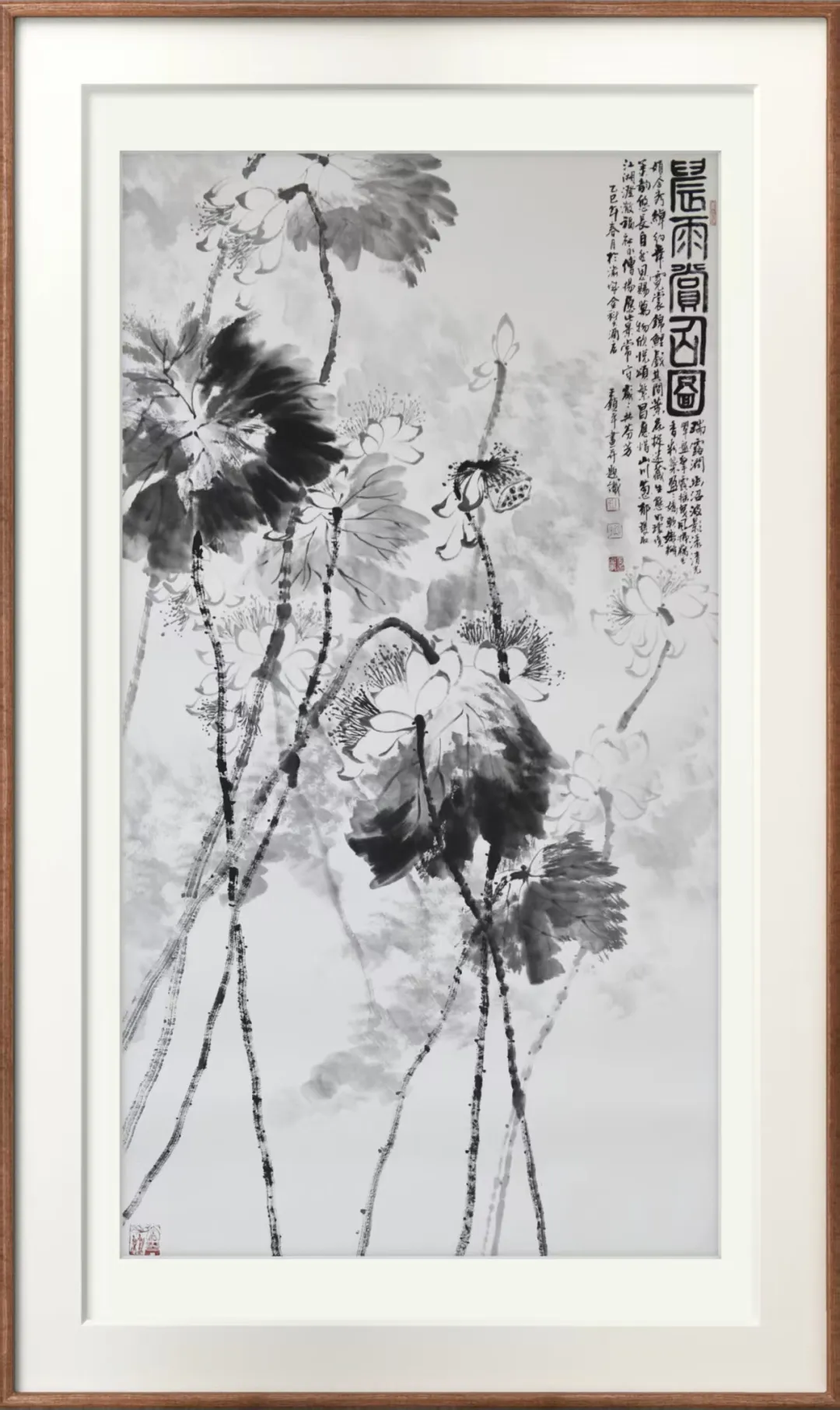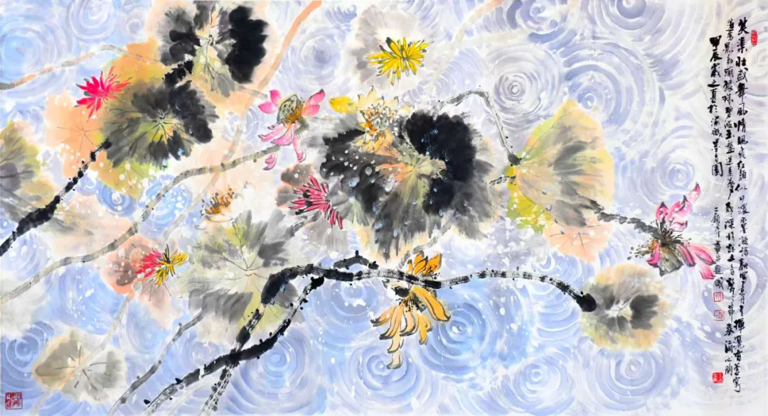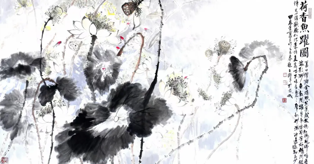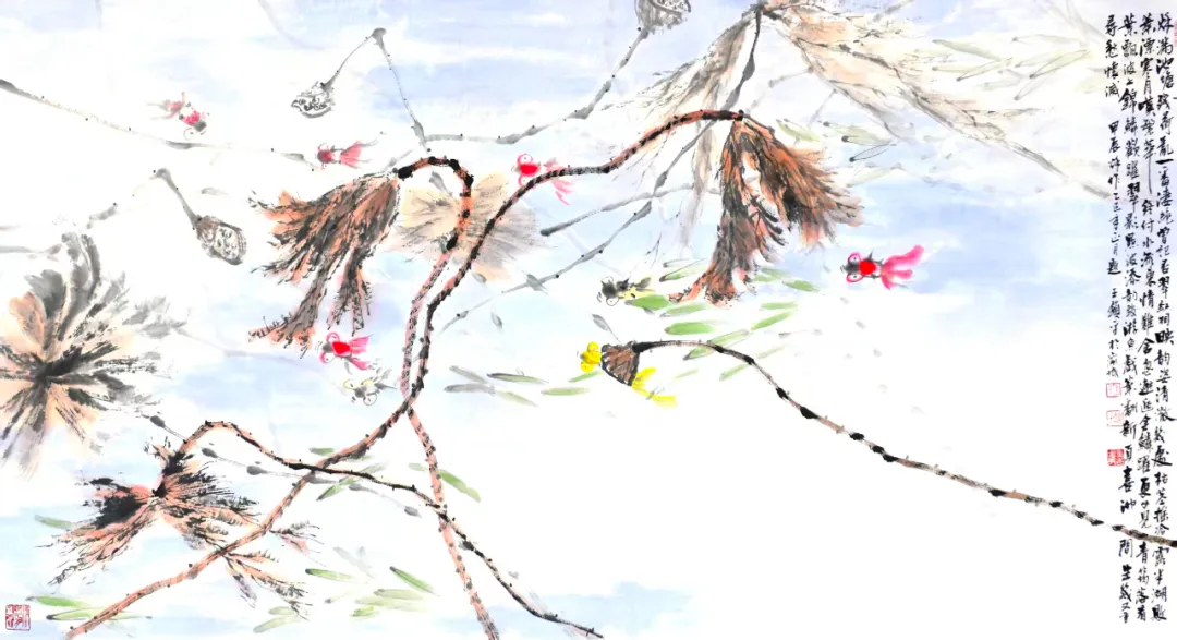 在坚守水墨本体语言与文人画精神内核的同时,王锁平的作品展现出强烈的个性探索与时代气息。其创新性并非外在形式的突兀求变,而是内化于笔墨语言的精微拓展之中。在色彩运用上,他极为克制而大胆:或以朱砂点染秋山红叶,醒豁全局;或以粉彩勾勒春山花树,平添生机;在残荷作品中,更以鲜亮的锦鲤之“红”与“金”,撞击枯荷残叶的“灰”与“赭”,在强烈的色彩与生命状态的对比中,迸发出关于繁华与寂灭、逝去与新生的深刻哲思。在构图与意境上,他既承袭“高远”、“深远”之法,又融入现代的构成意识与视觉张力,使画面在古朴中见新颖,在宏大叙事中不乏精微的情感触点(如山间行人、江岸人家)。其笔下山水,因而既是古典意境的当代回响,也蕴含着对当下人与自然关系的静观与对家国情怀的含蓄表达(如“兰甫精神”所寓)。