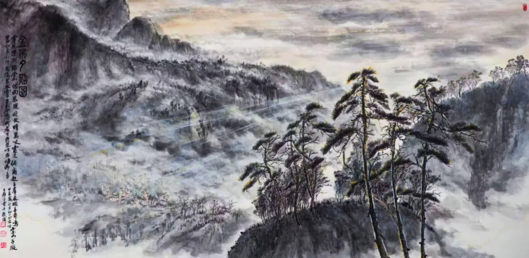 其山水画作的核心魅力,首先在于对自然雄浑气魄的萃取与升华。无论是描绘黄山云海的翻腾涌动、金佛夕照的万丈霞光,还是陇南山川的浑厚苍茫,艺术家皆以苍劲老辣的笔法勾勒山石筋骨,又以水墨淋漓的皴擦晕染塑造体量。画面中,山峦往往如巨灵般拔地而起,结构奇崛,气势逼人。尤为精妙的是对“云”与“光”的处理:那氤氲流淌的云霭,并非静止的留白,而是通过淡墨的微妙层次与笔势的引导,在峰峦间自由舒卷、吞吐呼吸,成为联结虚实、活化全局的“气脉”。而“夕照”、“春晴”等主题中对光影的暗示性表达,则让沉厚的山体焕发出内在的生命辉光,营造出“时空凝聚于一瞬”的永恒感与神圣感。这超越了对具体景点的再现,升华为对天地玄黄、宇宙洪荒的宏观精神意象的营造。
