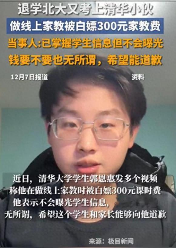 近日,清华大学学生郭恩惠发布多个视频,称他在做线上家教时,被白嫖300元课时费。今年上半年,郭恩惠退学北大后又考上清华的经历受到众人关注。12月7日下午,郭恩惠告诉极目新闻记者,他不会曝光学生信息,钱要不要也无所谓,希望这个学生和家长能够向他道歉。