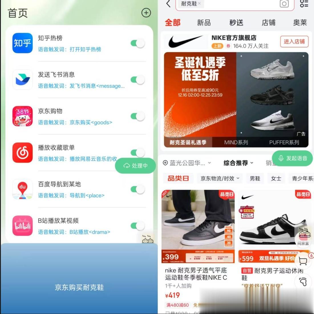 再比如说,笔者想要买双耐克鞋。以前,我只能手动找到某东或者某宝,打开后手动输入关键词“耐克鞋”,点击确认才能进行搜索,然后手动滑动页面寻找我喜欢的款式,现在我只需要对煎饺APP说句“京东购买耐克鞋”,煎饺就会听懂并且瞬间执行操作,映入眼帘的直接就是供我选择的耐克鞋展示页面。以上这些曾经需要我们亲自动手才能够完成的复杂流程,现如今自从有了煎饺APP,这一切都可以只动嘴就完美实现,效率实在哇塞,真正整整解放了双手。