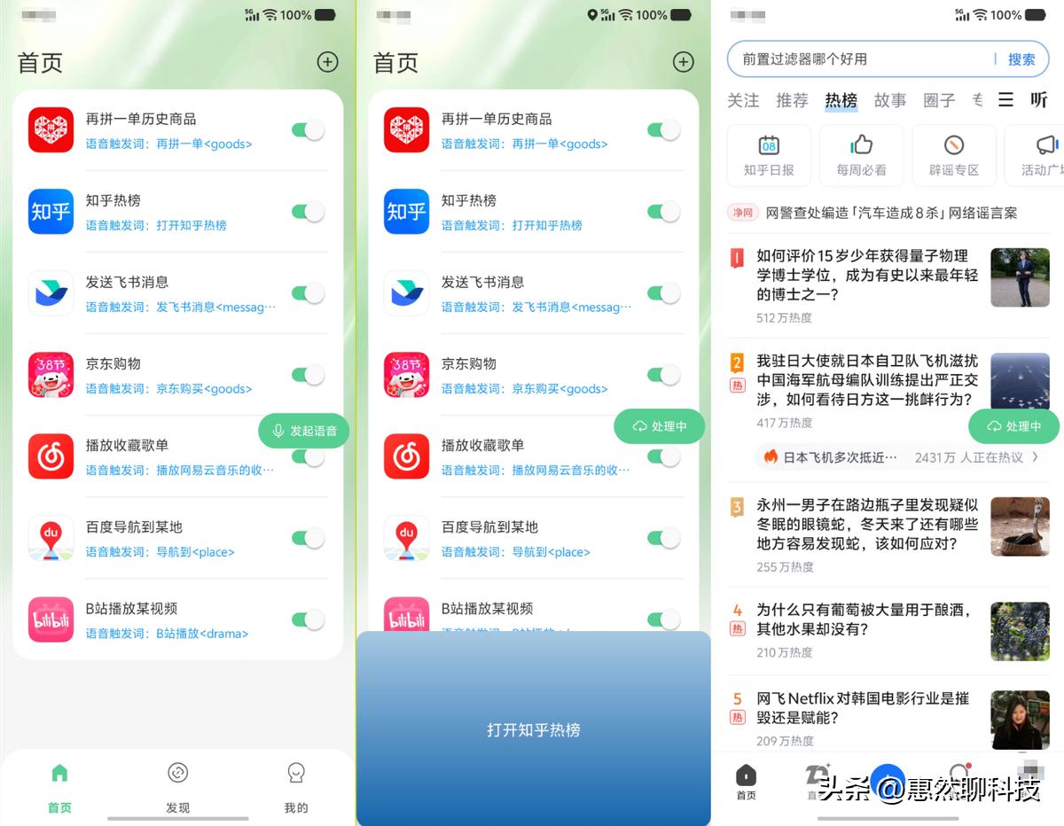 笔者平时经常使用的应用,现在都可以利用煎饺APP进行语音联动操作了。比方说我每天下班后,喜欢懒在沙发上刷知乎热榜,以前我只能用手解锁手机-找到知乎并打开-进入搜索热榜-用手指滑动点击我想看的内容,现在自从拥有了煎饺APP,我只需说出“打开知乎热榜”,手机立马就能自动完成上面我叙述的全流程,效率提升那叫一个快,真真正正做到了解放双手,简直不要太爽。