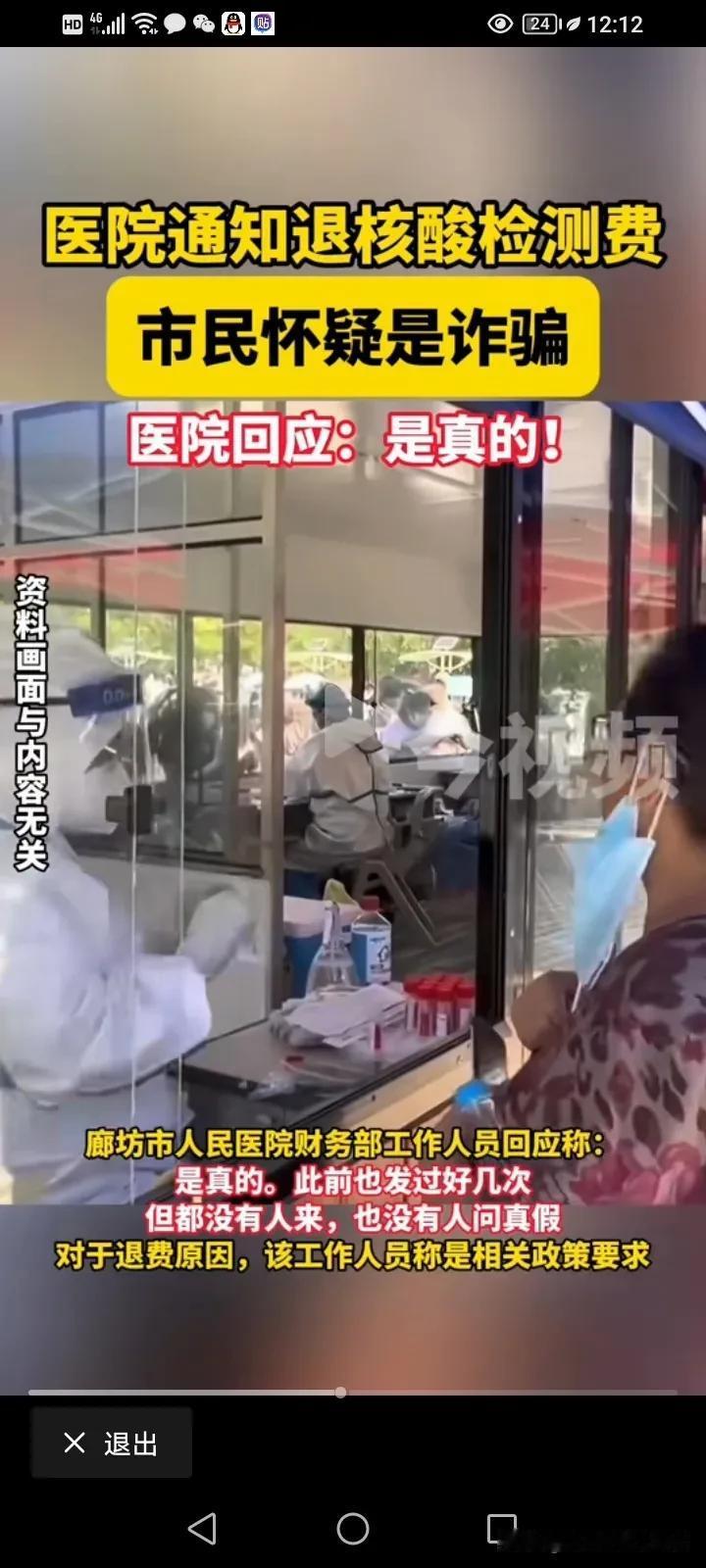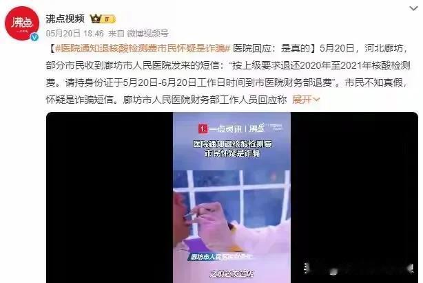 核酸检测费居然可以退了!!是真的!5月20日,河北廊坊,这市民收到了医院发来的短信,说可以按上级的政策可以退回2020~2021这两年的核酸检测费。 但很多市民以为这是诈骗短信,所以没有去退,经过医院的核实,确实是可以退,只要持身份证于5月20日~6月20日这一个月之内的任何工作日时间到医院财务部就可以退费了! 我记得我们广东刚开始的时候测一次核酸要69块钱,还是68块钱,后面就是30多,在后面就是10块、5块的,反正自费验的人都不少,因为出了市就得检测,要不码都会变黄变红,那时候免费的人太多,自费的又很贵,但是你不验真的是寸步难行! 但是如果要拿身份证去医院退,我觉得就完全没有诚意啊,你财政申请都退下来了,你应该原路返还啊,当时都是微信转账,可以直接退回微信或银行卡,干嘛搞的这么复杂,让市民再去医院退,那确实挺麻烦的。不知道我们广东什么时候可以退呢?