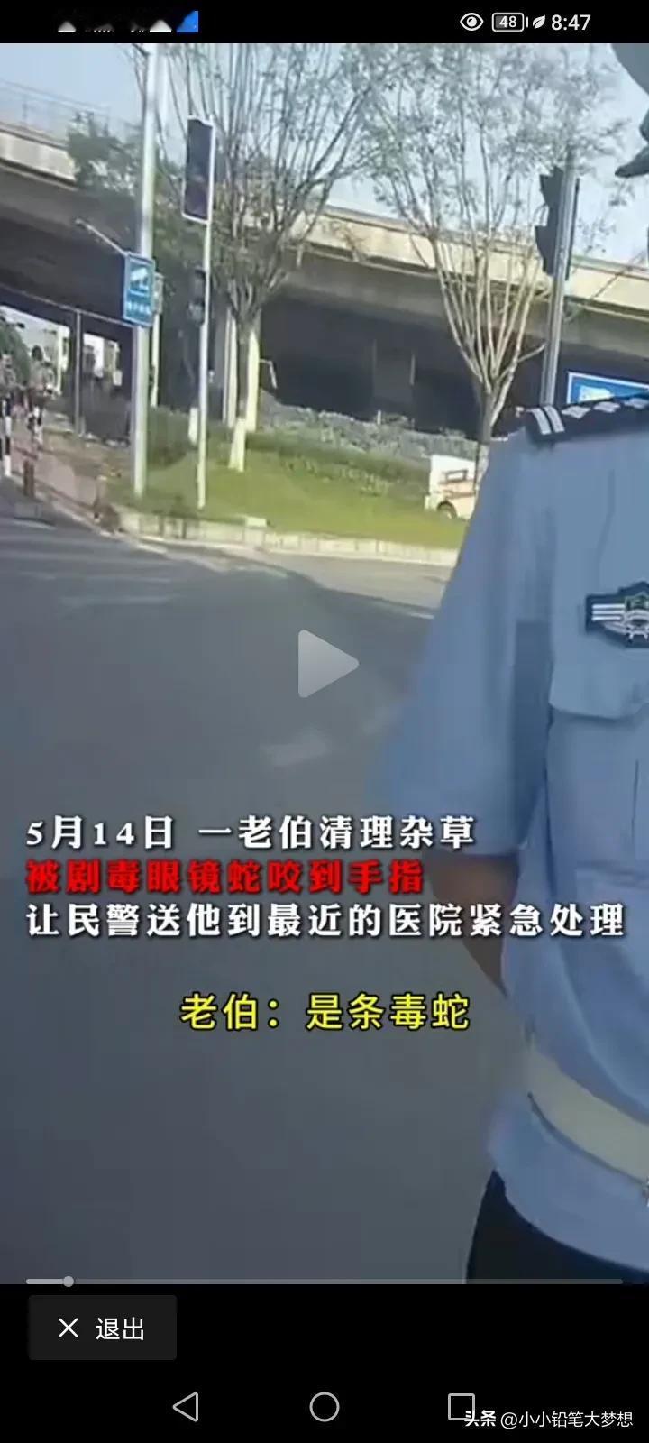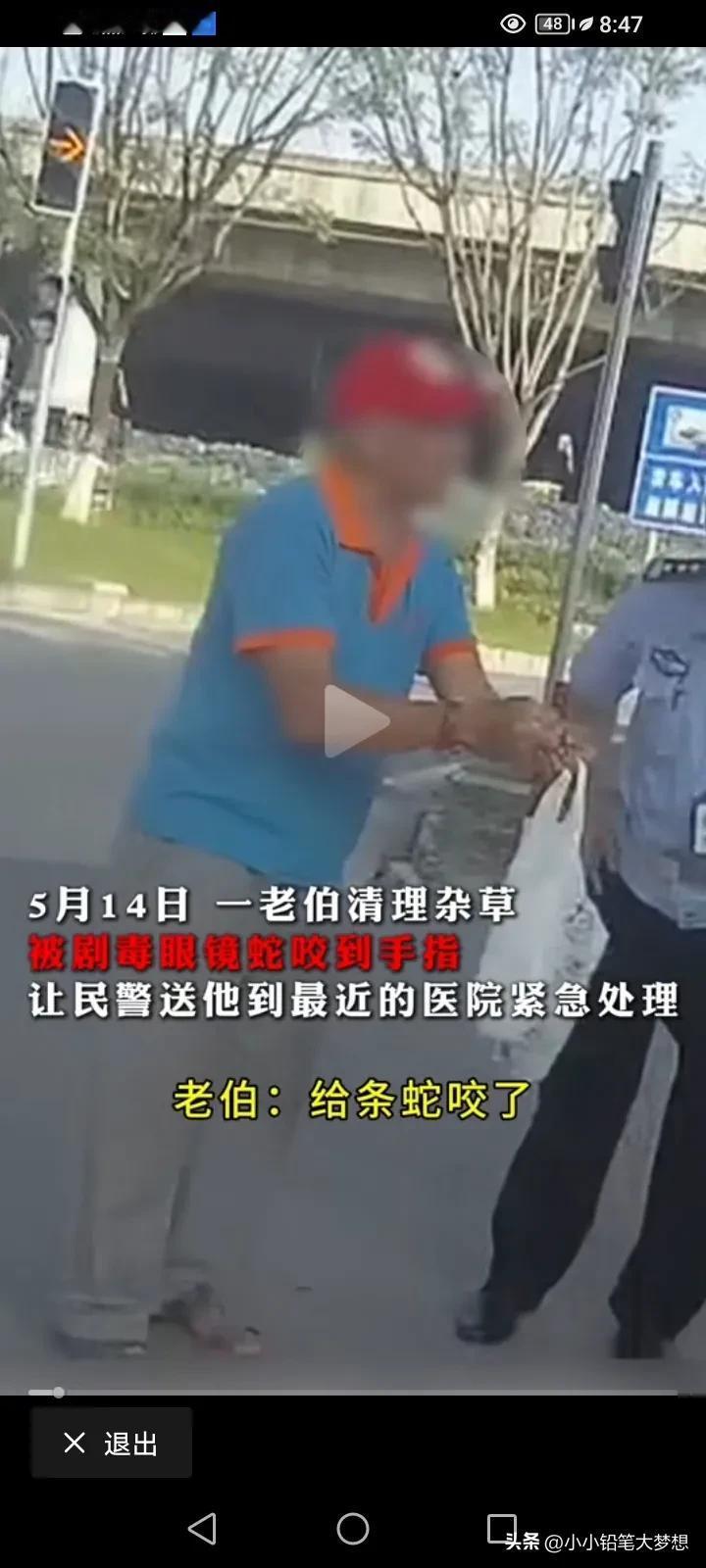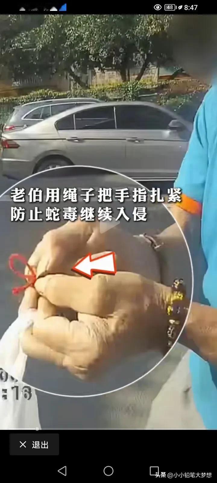佛山的这位阿伯真聪明,他这种做法真的很值得大家借鉴,如果不是这样做,他可能连命都没,阿伯在处理杂草的时候第被一条毒蛇“饭铲头”也叫眼镜蛇咬伤。 他第一个反应把这条蛇打死,这样蛇就不会去伤害第二个人,他取来了一条红色的绳子把咬伤的手指给扎紧,这样子毒素不会大范围扩散。 他立马报了警,拿了个塑料袋,把蛇给装走,为的是想让医生能够看到这条蛇对症下药。 警察来到之后,他跟警察说我被毒蛇咬,警察第一时间开着警车想把他送到最近的医院,在送院的过程中,阿伯就已经感觉很难受,警察提醒他不要睡,千万不要睡! 警察把他送到最近的医院之后,这家医院说他们这里没有血清,要到市一医院或者是佛山中医院才行,医务人员快速沟通得知市一医院有,为了安全起见,不能再坐警察的车了,一定要坐120方便抢救,所以警察开道为120的开道,还好阿伯得到了及时的救治,挽回了生命! 不得不说,阿伯这波操作还真挺聪明,救了自己一命。 很多人说,为什么这些乡镇医院都不备血清呢?我的了解是乡镇医院还真的没有备血清的,第一,血清需要恒温冰箱,设备是有要求的;第二,备不起且九成以上会废掉,因为血清供应量少,品种多,保质期又短,价格还贵,所以一般,医院都不进,因为怕浪费,有什么急要的事情都是要调用的。