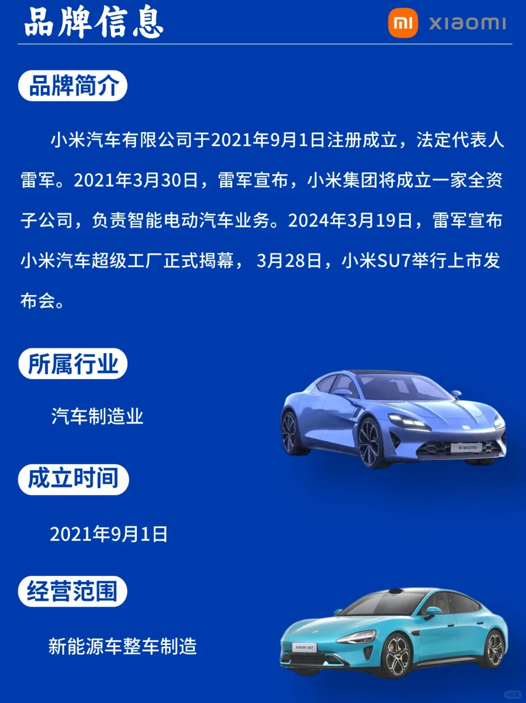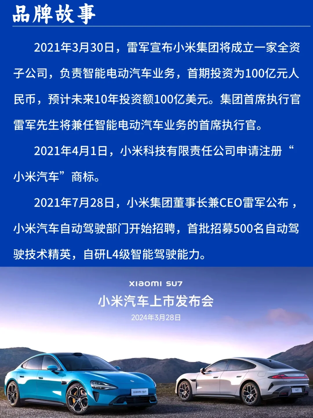 [一R]2021年3月30日,雷军宣布,小米集团将成立一家全资子公司,负责智能电动汽车业务 [二R]2024年3月19日,雷军宣布小米汽车超级工厂正式揭幕 [三R]2024年3月28日,小米SU7举行上市发布会!
