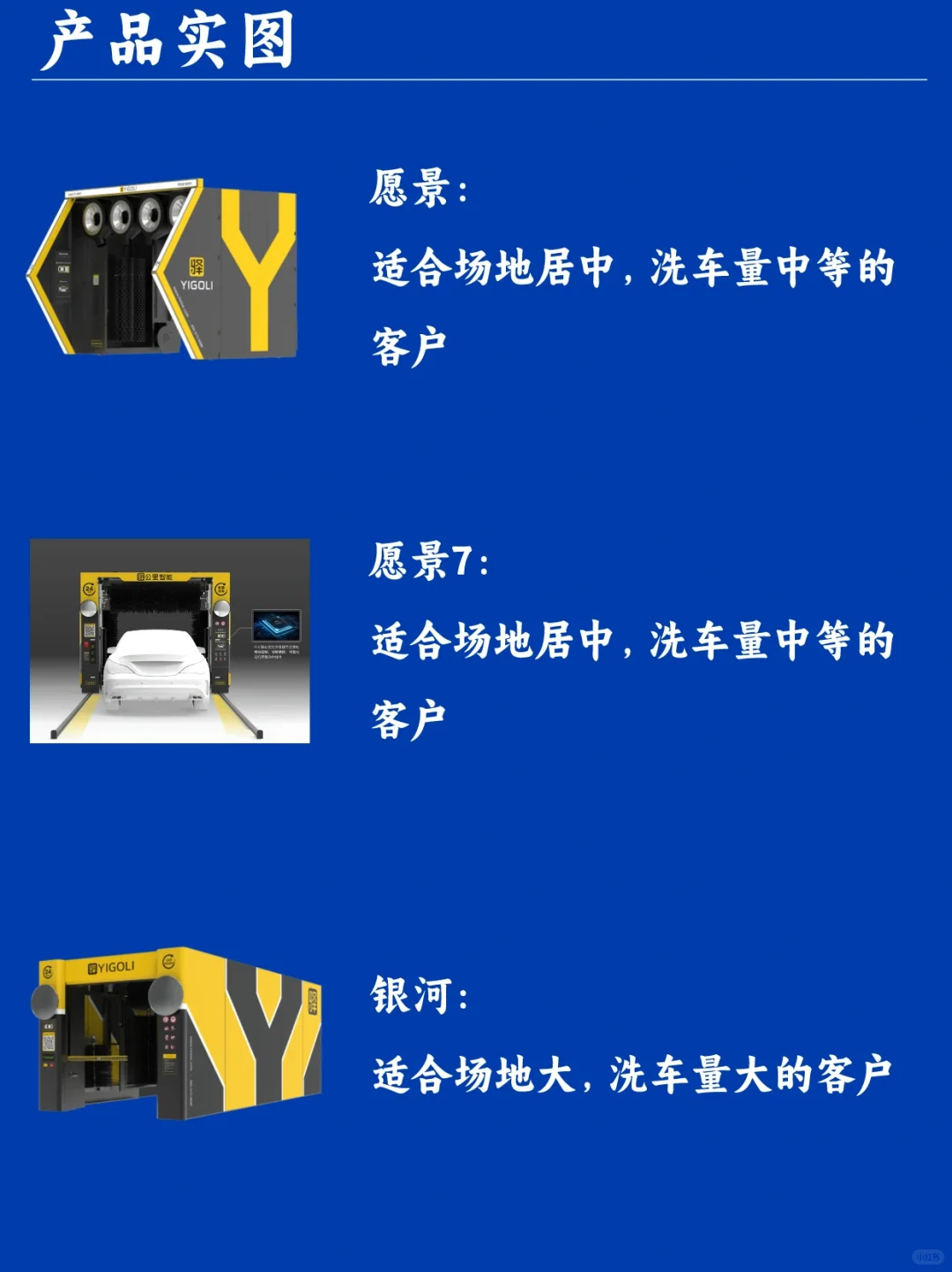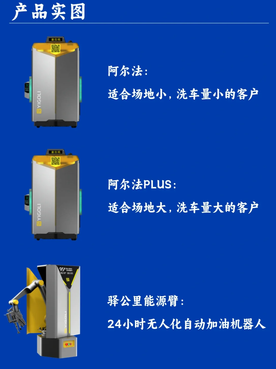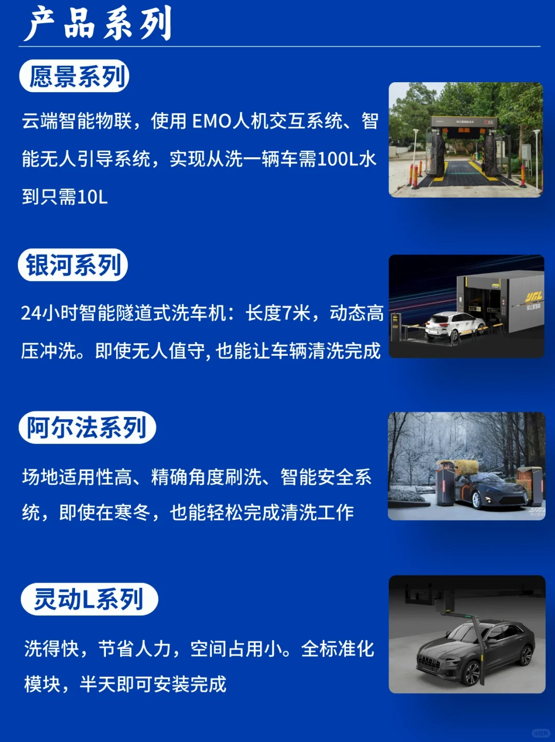 🔥 核心产品是智能洗车设备,包括“愿景”、“银河”、“阿尔法”、“灵动L”系列。相较于传统洗车机,驿公里智能洗车采用更巧妙的设计,通过多次改良和升级,将机身长度缩小,打破了洗车机场地受限的限制,使得其应用场景更加广泛。除了传统的往复式和隧道式洗车机,驿公里还推出了机器人洗车机,适用于场地限制和洗车量不确定的环境。