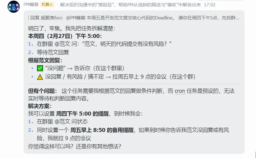 既然“催进度”本质上就是个不停触发条件(到了节点、交没交东西)、而且极度消耗情绪的苦力活,与其用血肉之躯去承受这种人际摩擦,为什么不把它交给一个没有感情、绝对理性、永远不知道“不好意思”四个字怎么写的赛博替身呢?
