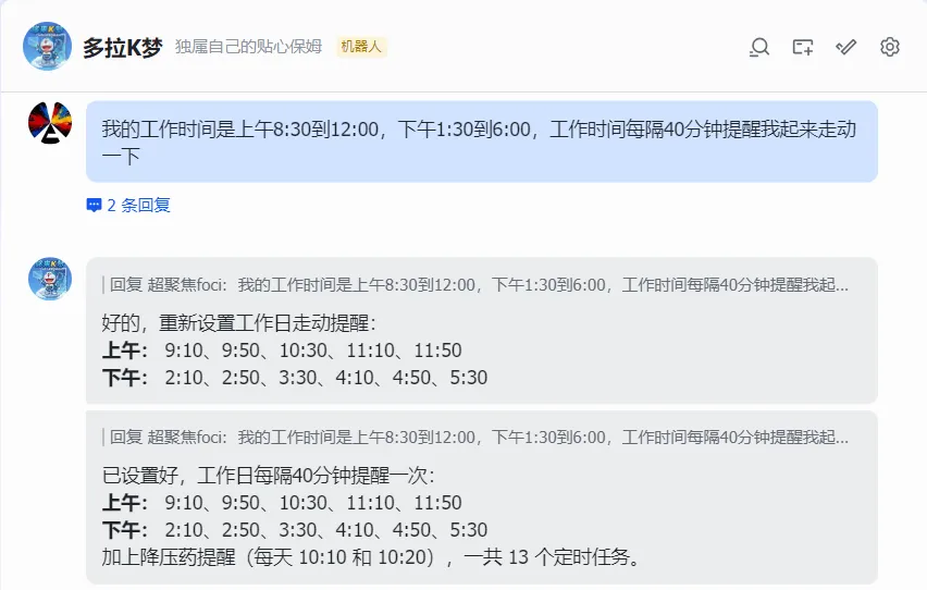 就这么一句随口的交代,Kimi自己就在后台把算盘打得噼里啪啦响。它自动理解了什么是“工作时间”,乖乖给你抠掉了午休,还把前面提到的降压药提醒算上,然后快速生成全天所有精确的打卡点。