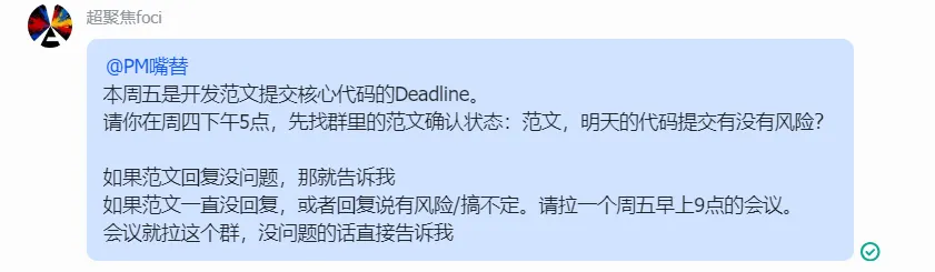 比如本周五是核心代码提交的Deadline,作为PM你必须在周四下班前摸底研发同学(范文)的进度状态。按理来说你要在周四下午就硬着头皮去群里发一句:“@范文,明天的代码提交有风险吗?”然后开始焦虑地等待回复。如果不回,或者说搞不定,你还得一个一个去敲定大家的时间,拉一个周五早上的紧急对齐会。