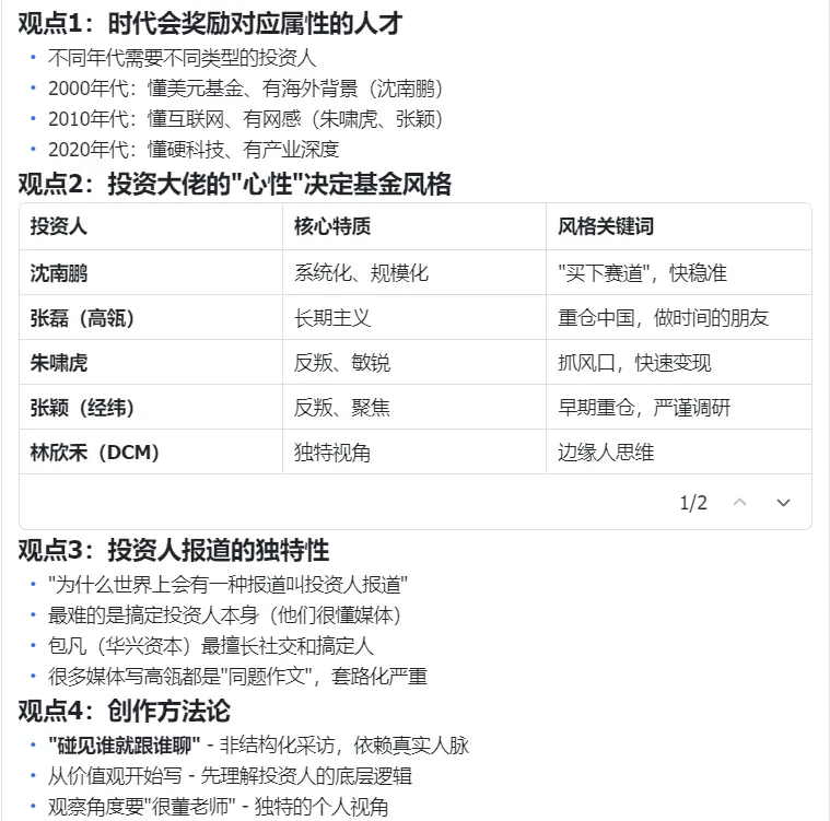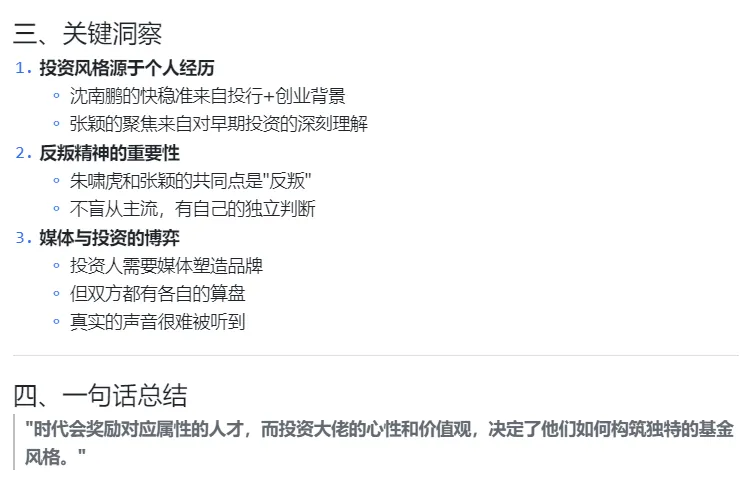 不仅按年代梳理了投资人属性,还拉了个表格,把沈南鹏、张磊、朱啸虎等大佬的核心特质与基金风格对标得清清楚楚。最后连“反叛精神”这种关键洞察和一句话总结都给你提炼好了。主打一个全程不切应用,干货直接喂到嘴边。