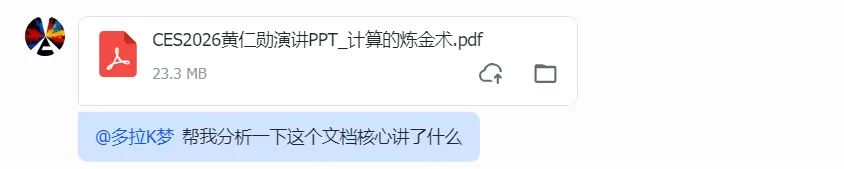 这次我连网页都没开,直接在飞书里把文件糊到了“多拉K梦”的脸上,像@同事一样甩了一句:“帮我分析一下这个文档核心讲了什么”。
