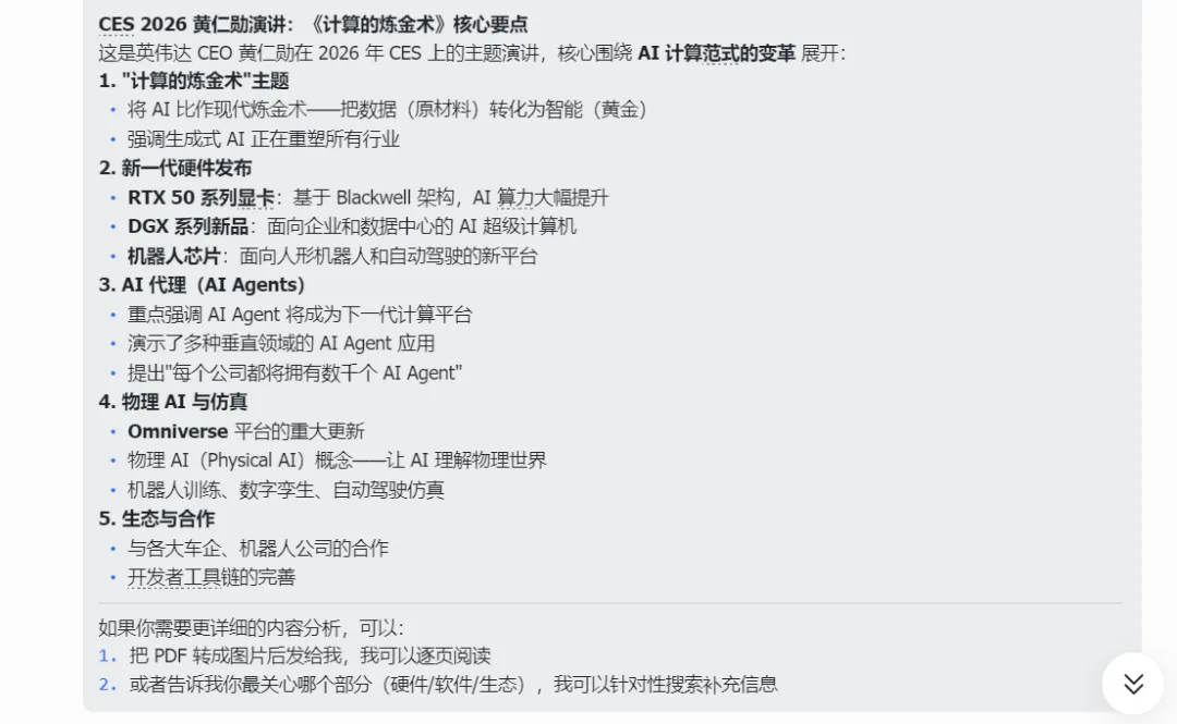 首先,作为一个经常需要看大厂战略方向、输出洞察材料的打工人,啃几十页的行业报告是家常便饭。比如今年CES 2026,老黄那份《计算的炼金术》PPT足足有71页。