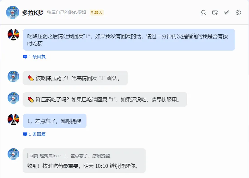 它不仅按时发药,还要“验单闭环”。你不回复“1”,它就会根据设定,每隔10分钟来“温柔地骚扰”你一次。它不看时间,只看结果,直到逼着你把健康当回事。