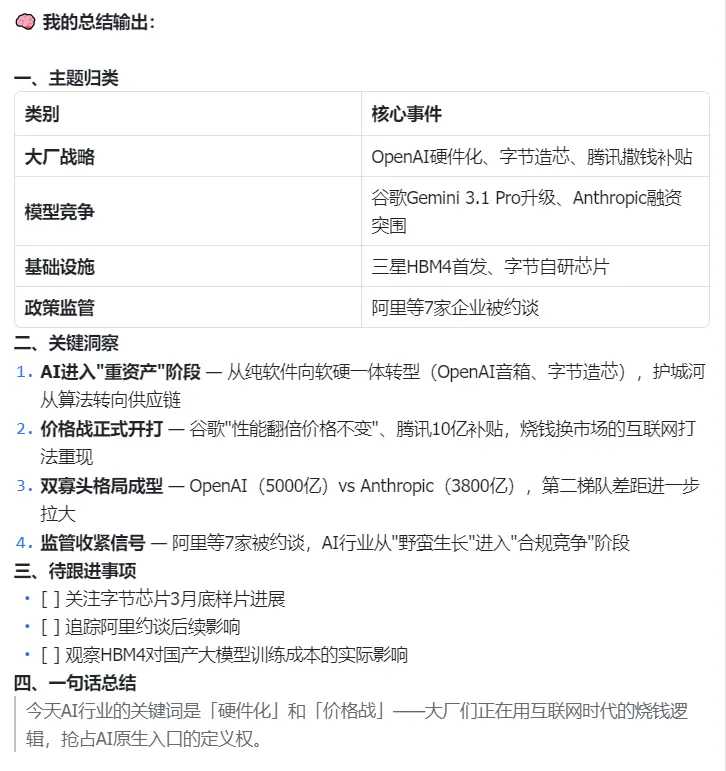 收到指令后,KimiClaw直接聊天界面甩回一份“高管汇报级”的结构化摘要。