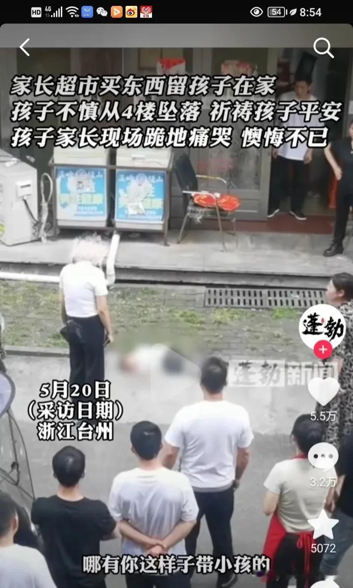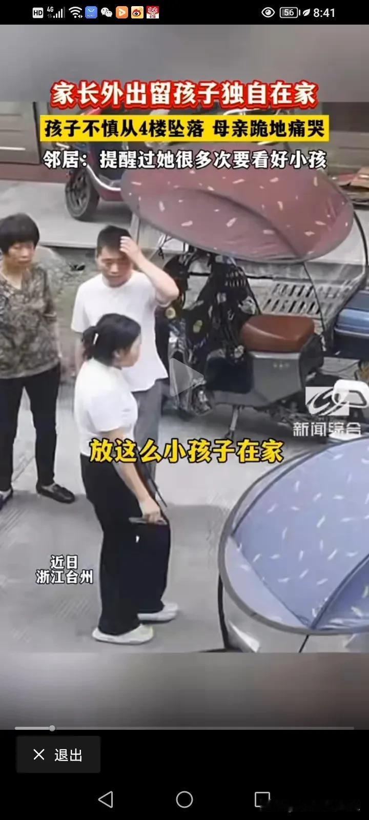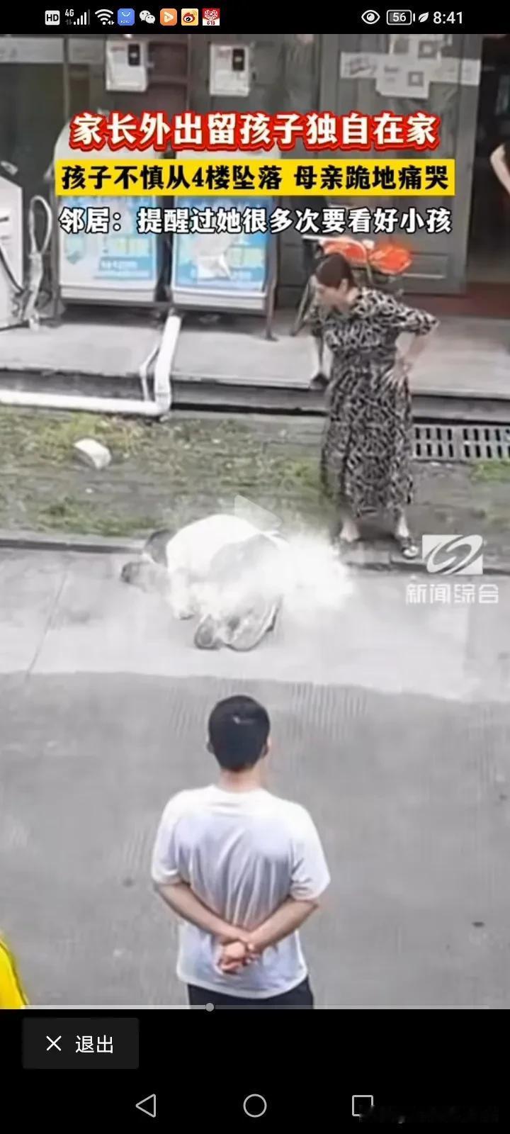 太惨了!5月20日,浙江台州,一位妈妈把小孩子独自留在家里,然后去超市买东西,孩子从4楼的窗户坠落,旁边的路人发现之后急忙打的120和110。 小孩躺在冰冷的水泥地上,没有人敢动他,围观的人着急的不得了,因为孩子的妈妈还没回来,过了好一段时间,孩子的妈妈终于出现,她看到围观的人,还不知道发生什么事,站在那里蒙圈。 一位穿着黑色花裙子的阿姨指着这位年轻的妈妈大骂:“哪有你这样子带小孩的,你放他一个人在这里,我已经提醒你很多次了,要注意小孩,要注意小孩!” 她才注意到地上躺的是她的孩子。 她跪在地上痛哭的喊着孩子的名字,后悔不已! 后来,警方抵达,看着120还没有到,他对着妈妈说,不能再等了,要不就来不及了,你抱着孩子,我拉响警报给你拉到医院去! 这孩子不知道最后怎么样?但是浙江IP的人都说他没,真是悲剧啊,看见这窗户也没有安装围栏,而且这楼下的还是水泥地,孩子妈妈在那里大哭叫着孩子,孩子一点反应都没有,看着这一幕,心痛的不得了! 这么小的小孩,怎么可以把他扔在家里,自己一个人出去?反正我是无法理解,因为孩子不在我视线之内,我都会心慌。 这位妈妈应该后悔极了,这位阿姨也是好心人,孩子的妈妈心太大了,不出事无所谓,出了事后悔莫及!