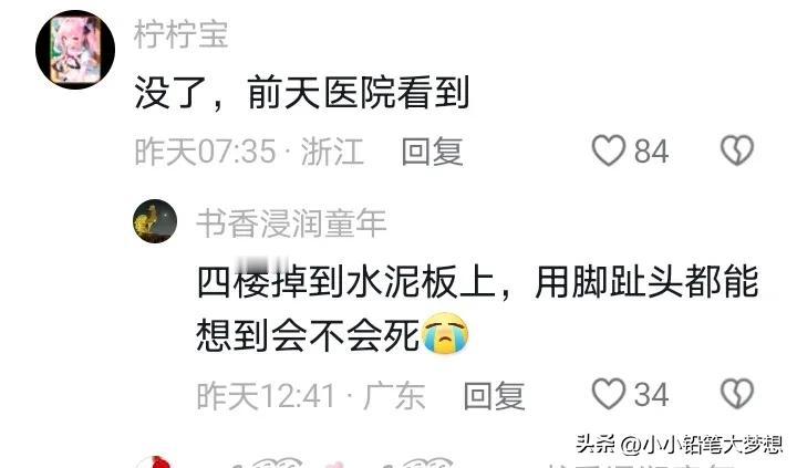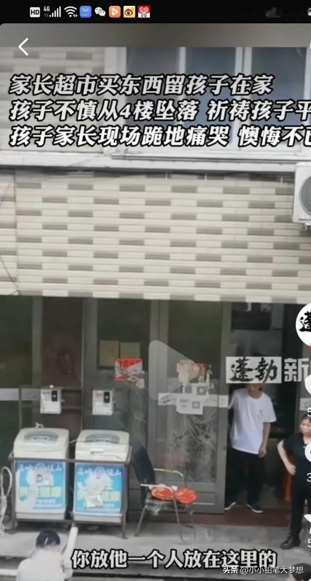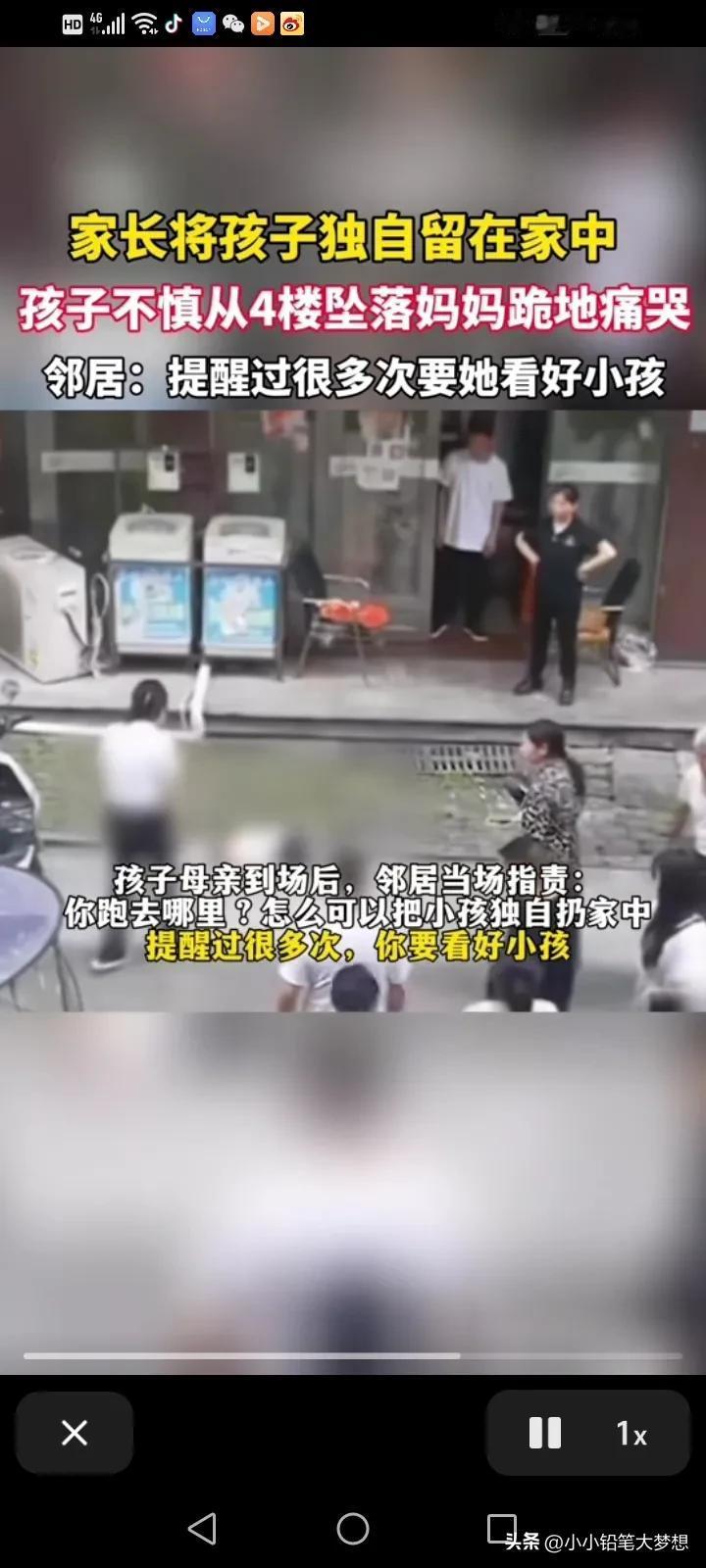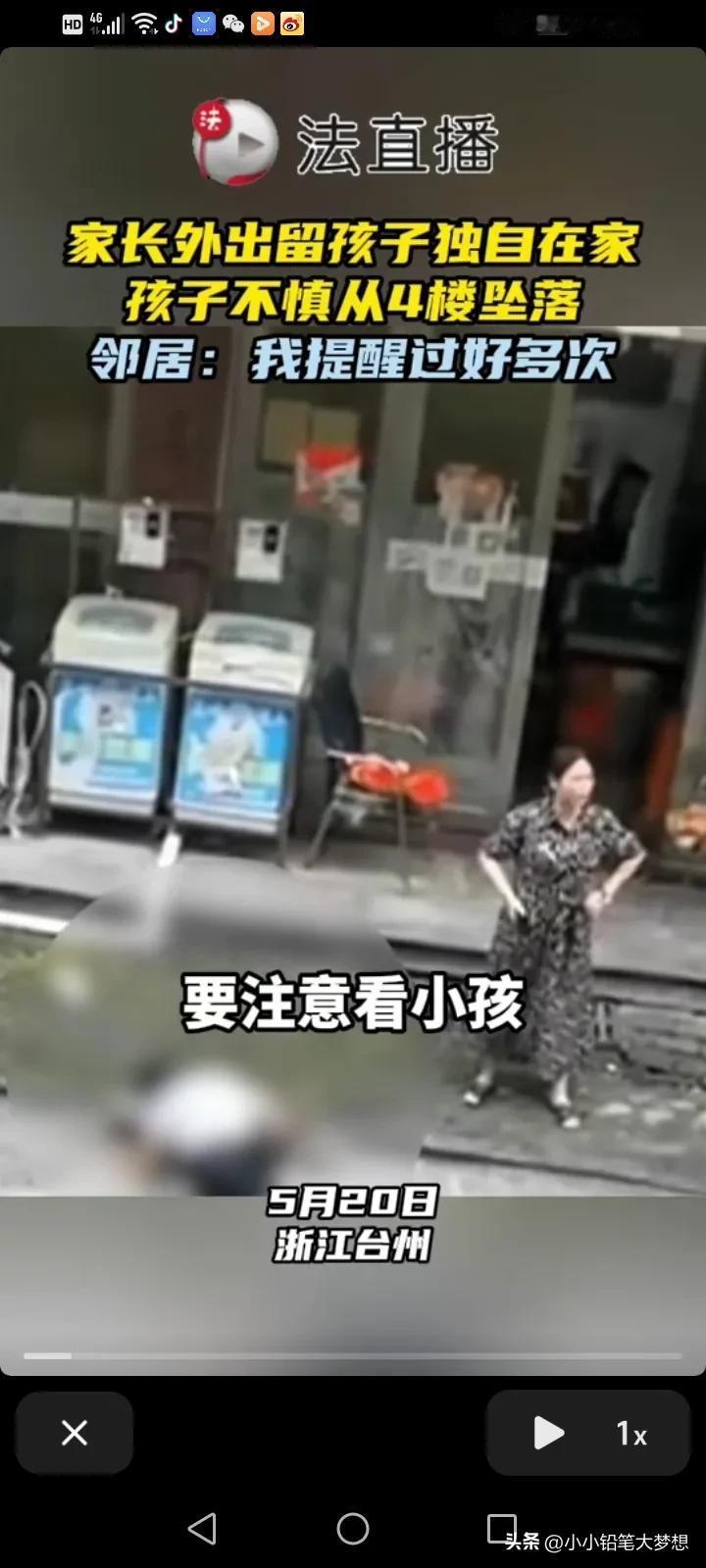 太惨了!5月20日,浙江台州,一位妈妈把小孩子独自留在家里,然后去超市买东西,孩子从4楼的窗户坠落,旁边的路人发现之后急忙打的120和110。 小孩躺在冰冷的水泥地上,没有人敢动他,围观的人着急的不得了,因为孩子的妈妈还没回来,过了好一段时间,孩子的妈妈终于出现,她看到围观的人,还不知道发生什么事,站在那里蒙圈。 一位穿着黑色花裙子的阿姨指着这位年轻的妈妈大骂:“哪有你这样子带小孩的,你放他一个人在这里,我已经提醒你很多次了,要注意小孩,要注意小孩!” 她才注意到地上躺的是她的孩子。 她跪在地上痛哭的喊着孩子的名字,后悔不已! 后来,警方抵达,看着120还没有到,他对着妈妈说,不能再等了,要不就来不及了,你抱着孩子,我拉响警报给你拉到医院去! 这孩子不知道最后怎么样?但是浙江IP的人都说他没,真是悲剧啊,看见这窗户也没有安装围栏,而且这楼下的还是水泥地,孩子妈妈在那里大哭叫着孩子,孩子一点反应都没有,看着这一幕,心痛的不得了! 这么小的小孩,怎么可以把他扔在家里,自己一个人出去?反正我是无法理解,因为孩子不在我视线之内,我都会心慌。 这位妈妈应该后悔极了,这位阿姨也是好心人,孩子的妈妈心太大了,不出事无所谓,出了事后悔莫及!