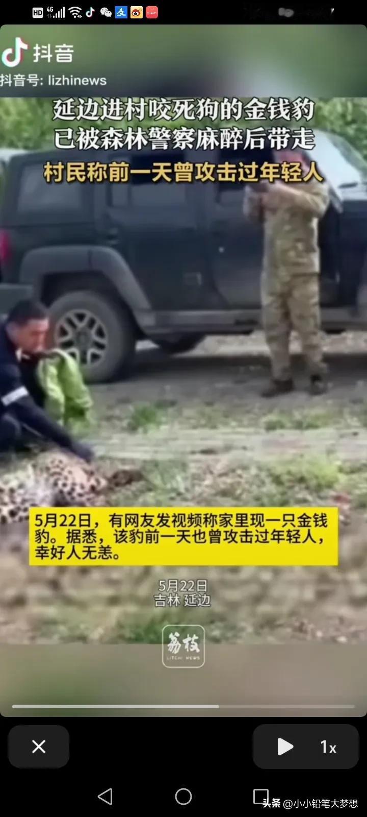 5月22号,吉林延边珲春,一名男子回家的路上遇到了一只东北豹,他把车停在路边,东北豹过来之后,他投喂了一点吃的,结果东北豹就缠着他,以为他还会给吃的,后来还啃上了他的汽车后视镜。 他开车成功逃脱,本以为这事就这么了,但没想到后来这只东北豹,还偷偷的跟到他家里去,还把他家里看门的那条狗给咬死。 因为怕它伤人,男子决定求助森林警察,森林警察来了之后,给它注射了麻醉剂,顺利带走,原来这只猎豹在前一天还攻击过一个年轻人,幸好没什么大碍。 刚开始的时候还感觉它挺可爱的,然后面咬狗了我就觉得挺可怕,我就觉得这玩意儿会被咬人,没想到它还真咬人了,之前就听同学说他们东北的村里有很多野猪,野鸡出没,唉呀,现在还来个东北豹[捂脸]。