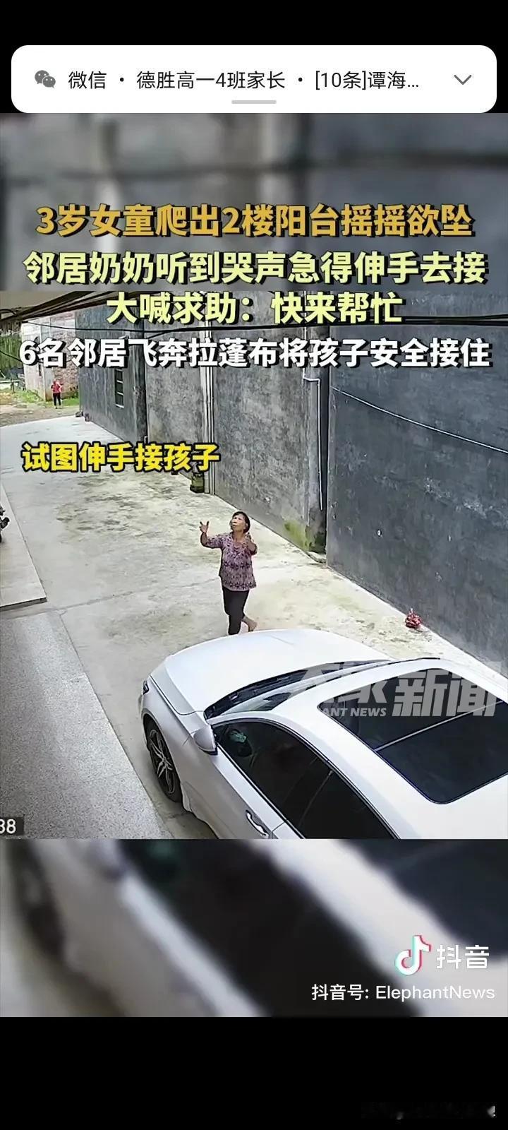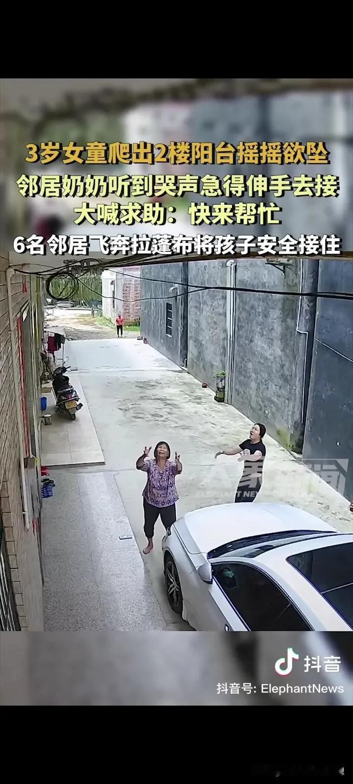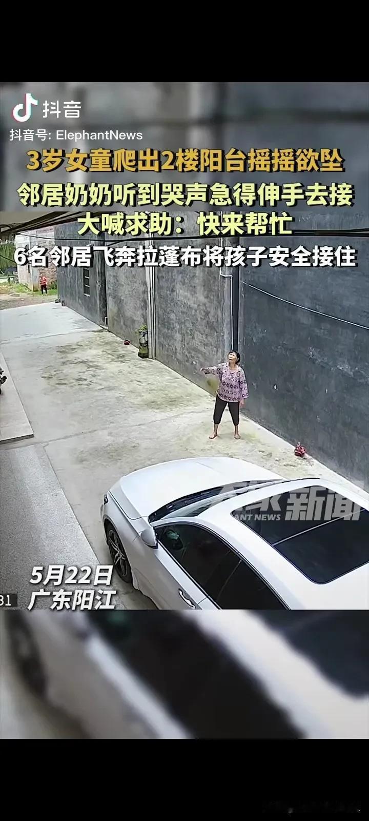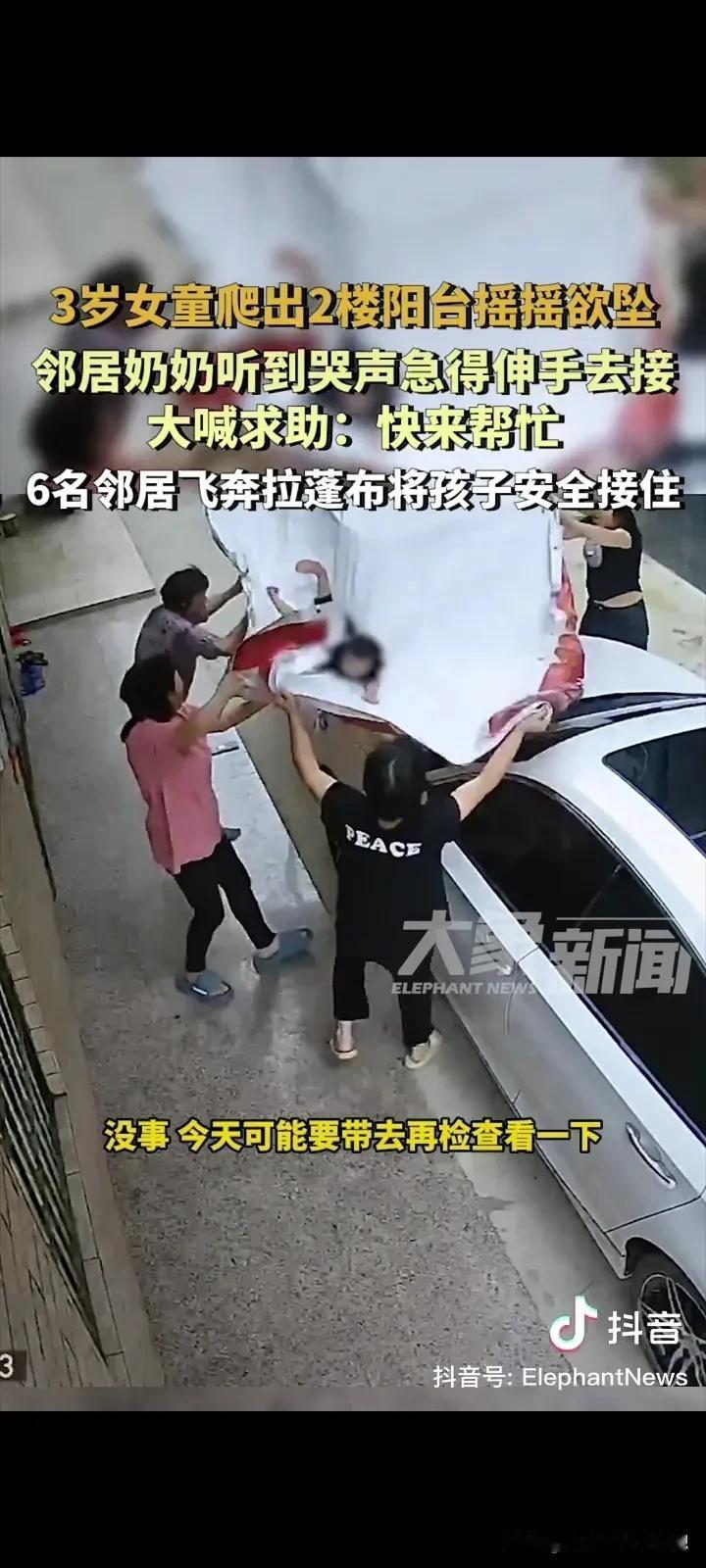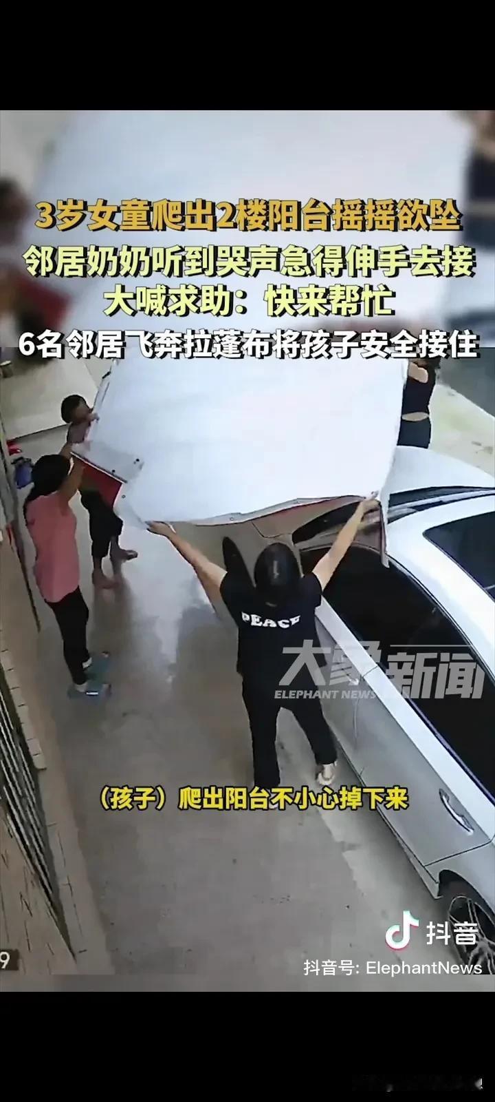 看的我心惊动魄,泪流满面,真是祖坟冒青烟了,有这么多好邻居!广东阳江,一个3岁的小女孩,爬出了阳台摇摇欲坠,一直哭着喊妈妈,一位老太太看见急忙上前想要接住,她发现自己的力量可能不够,所以大声喊来了一帮邻居帮忙! 老奶奶的喊声惊动了几个邻居,他们都纷纷出来想要徒手接住孩子,就在这时候,有一个机智的邻居拿来一张雨篷布,大家合力的把雨篷布张开,雨篷布刚摊开没多久,小孩子就坠落!还好,小孩安然无恙! 孩子的爸爸说,孩子的妈妈去接另外个孩子放学了,小孩爬了出来。 孩子的爸爸说感谢这些邻居给了孩子第二次的生命! 这真的是积了大德了,有这么多的好邻居,这小孩掉下来可不是开玩笑的,重则死亡、瘫痪,轻则骨折! 小孩坠楼的新闻已经被爆出来很多次,希望家长们能上点心,就算要外出,也要带上孩子,不要留下隐患,不然真是追悔莫及了!