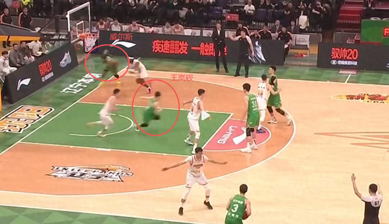 王岚嵚跑到上线,借着电梯门掩护吸引江苏3个人防守,这样威尔斯在篮下有巨大的空间,由于落后1分,打进2分和3分意义差不多,重体来看,王岚嵚的外线机会肯定没有威尔斯内线的机会好!