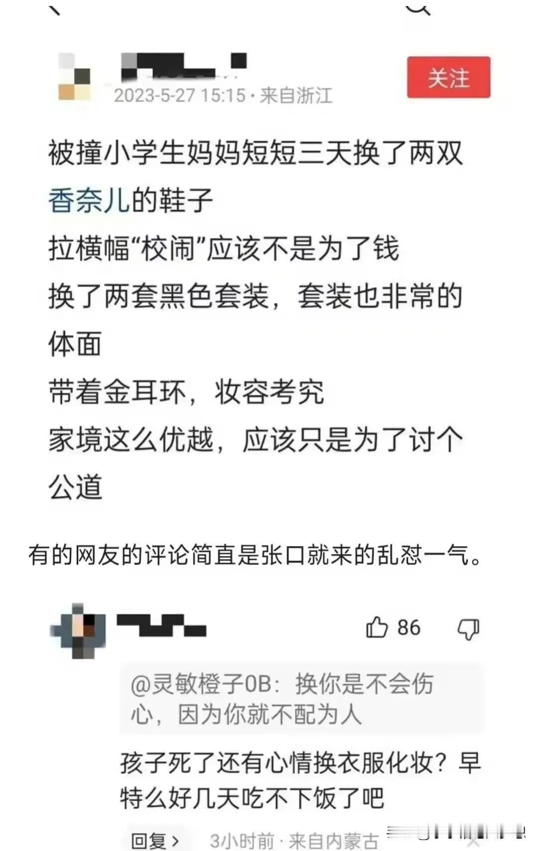 还记得这个被网暴的妈妈吗?孩子是去年5月23号被学校的老师撞死的,孩子的妈妈在6月2号跳的楼,没想到一年快过去了,每每想起真的令人唏嘘,妈妈和自己的儿子谭覃埋葬在一起,孩子的爸爸把他俩埋在了老家的院子。 网暴害人不浅,孩子妈妈在处理好儿子的后事之后,大家都在开心的过着六一,她却过了一个没有儿子的六一,在6月2号因为悲伤过度从24楼的家里一跃而下。 朋友圈的发文“很想念孩子,想陪孩子一起去”。 唉,当时网络上的言语真的是太恐怖了!那些人骂这位妈妈“冷静的可怕”、“想做网红吧”、“把自己打扮的那么漂亮”、“在学校拉横幅影响孩子上学就为了讹更多的钱”。。。 一个人的伤心,真的不能只看表面,有一种叫做伤心欲绝,在外表人的面前看上去很正常,但背地里会躲起来才会哭的。 当时,一些大v为了流量对孩子妈妈进行各种的网暴,最终导致封号,但是孩子的妈妈却没了,妈妈最后一条防线被击垮,最终选择跟孩子在一起! 这个世界上并不是非黑即白的,不要恶意去揣测别人,良言三冬暖,恶语伤人六月寒。
