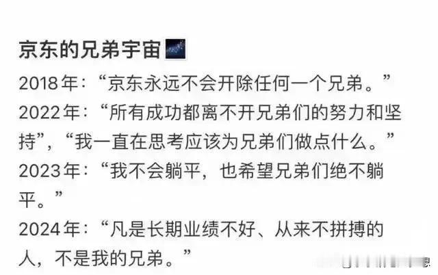 刘强东的内部训话出来了,但万万没想到的是遭到了群人的众嘲,京东现在的路确实不好走,裁员的前兆:抓考勤,调结构岗位,内部培训考核。 现在的环境变了,网络更透明,竞争力更大,别以为公司上了轨道就可以了,这几年,京东的服务确实下降了,自营商品真的是一言难尽,质量参差不齐,发货速度也是,他的内部训话确实有Pua的成份,确实没有公司会养闲人,其实东哥,这就是简单的雇佣剥削关系,别一口一个兄弟。 京东把自营商品经营好才是王道,把服务,质量把关好,送货快的优势体现出来,你不进步,别人就进步,现在的拼多多确实占很大的优势啊!