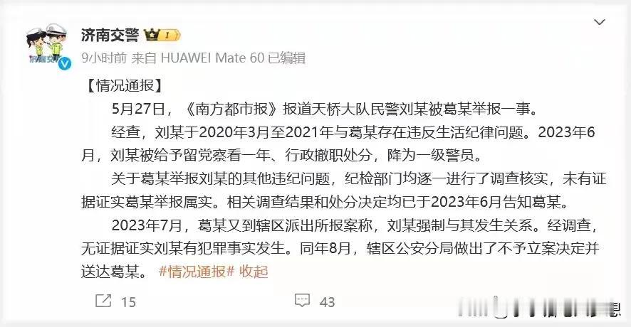 因为对处理结果不满意,她选择了实名再次举报!这个通报到底打了谁的脸?济南的交警天桥二中队原副队长刘斌这个罪状可不轻啊。1、隐瞒已婚身份,酒后强奸,手上有微信记录实据,但是不给立案。 2、交警刘某还有大额来源不明的财产,还收贿干着修改醉驾数据,抹掉扣分的违法违纪的事情!事情举报了两年多,按键兜兜转转,还是返回当地警局。 3、因婚外情被降级处理,但女子不接受处理结果,被威胁,还阻拦女子不让到市里举报,还到处诽谤女子,毁了女子的工作,还扬言威胁要用煤气罐炸死她。 4、刘某在2022年几乎就不上班,说是休假,但是工资照发,已经涉嫌吃空饷。 5、女子还透露,刘某的工作是找关系上位的! 济南公安很快出来回应此事:2023年6已经对他做出处罚,已降级处理,但无证据证实刘某有犯罪事实发生! 难以想象,以上种种罪状竟然只是降级?强奸、改醉驾数据、受贿这些情节都是子虚乌有?最奇葩的事情,刚开始的时候根本没办法立案,到后来兜兜转转,还是返回这个大队自己处理?那是自己去审自己人? 还是这名女子瞎说?但“家丑不可外扬”如果女子诬告那我觉得只有一个可能就是她有精神病,但是诬告的可能性很少,因为女子看上去精神病没有任何问题,一个女孩不可能实名认证把自己曝光出来,真拿自己的清白开玩笑?